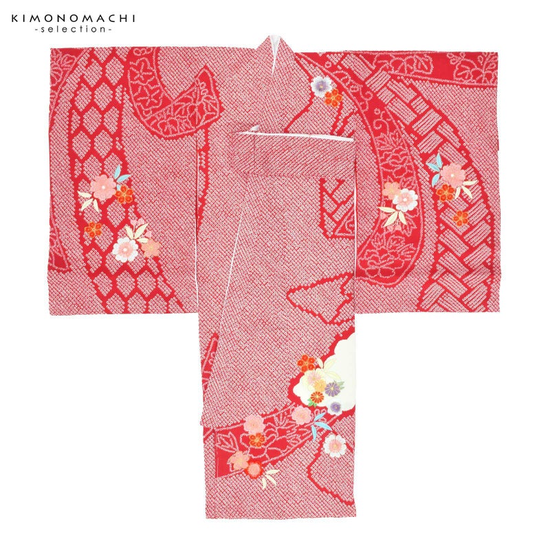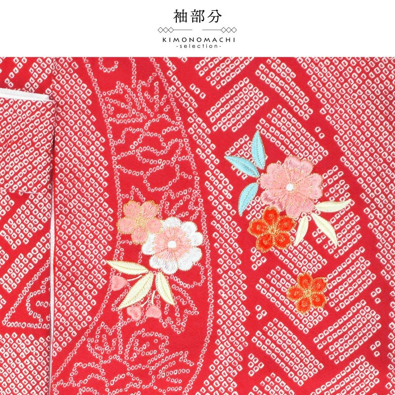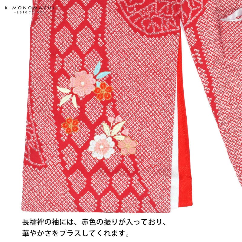 高級感がありつつも、女の子らしく可愛らしい雰囲気。絹特有の柔らかな光沢、美しい発色の生地に美しい模様。長襦袢の中に赤色の振りが入っており、華やかさをプラスしてくれます。細部に至るまで、こだわったお品です。