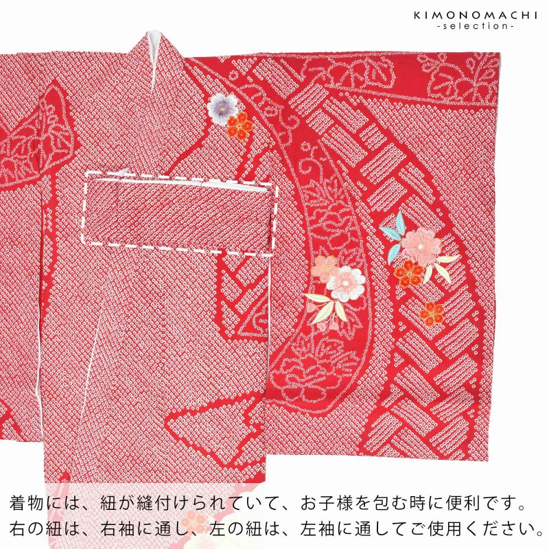 着物には紐が縫い付けられていて、お子様を包む時に便利です。右の紐は右袖に通し、左の紐は左袖に通してご使用ください。