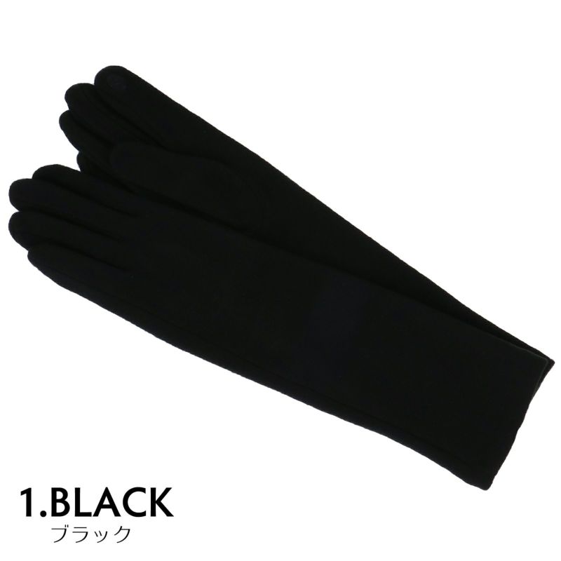 1.ブラック…黒のやわらかなアクリル生地。親指と人差し指の指先に、地の色と同系色のタッチパネル対応刺繍。シンプルなデザインで、着物の防寒にばっちりのロングタイプ手袋です。