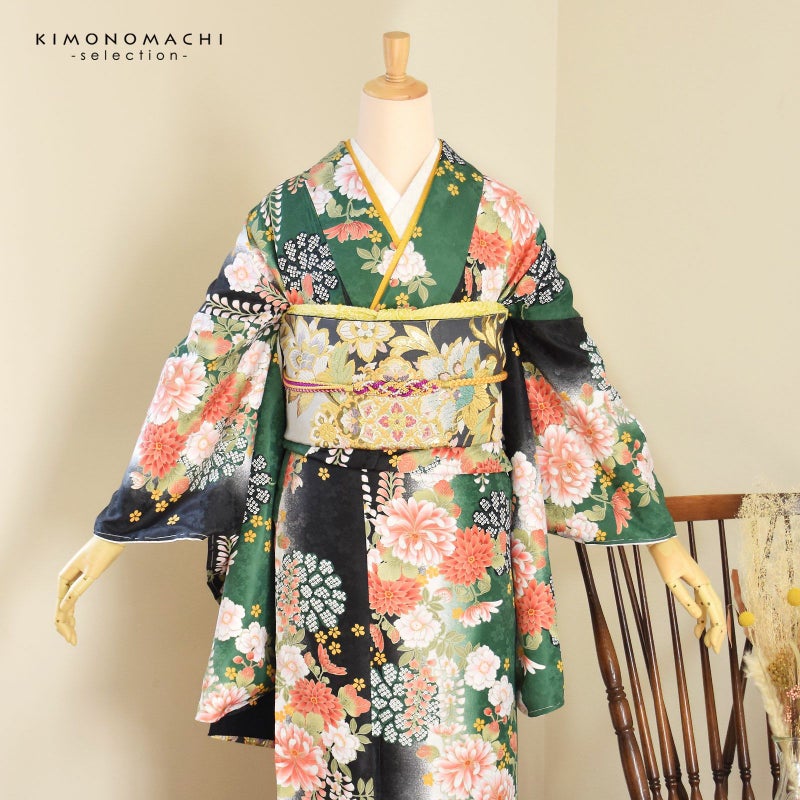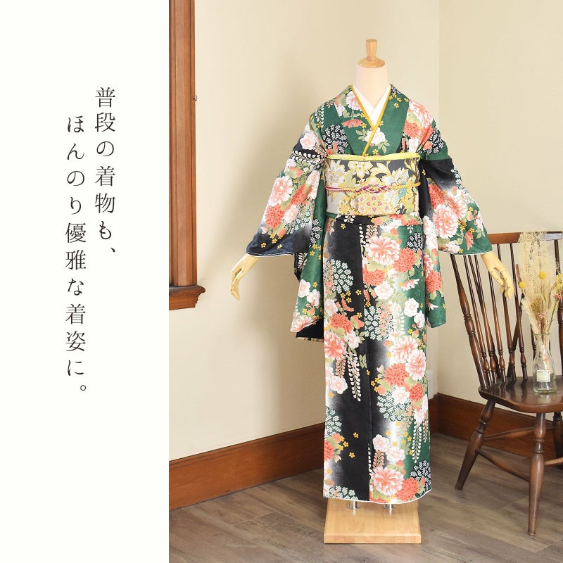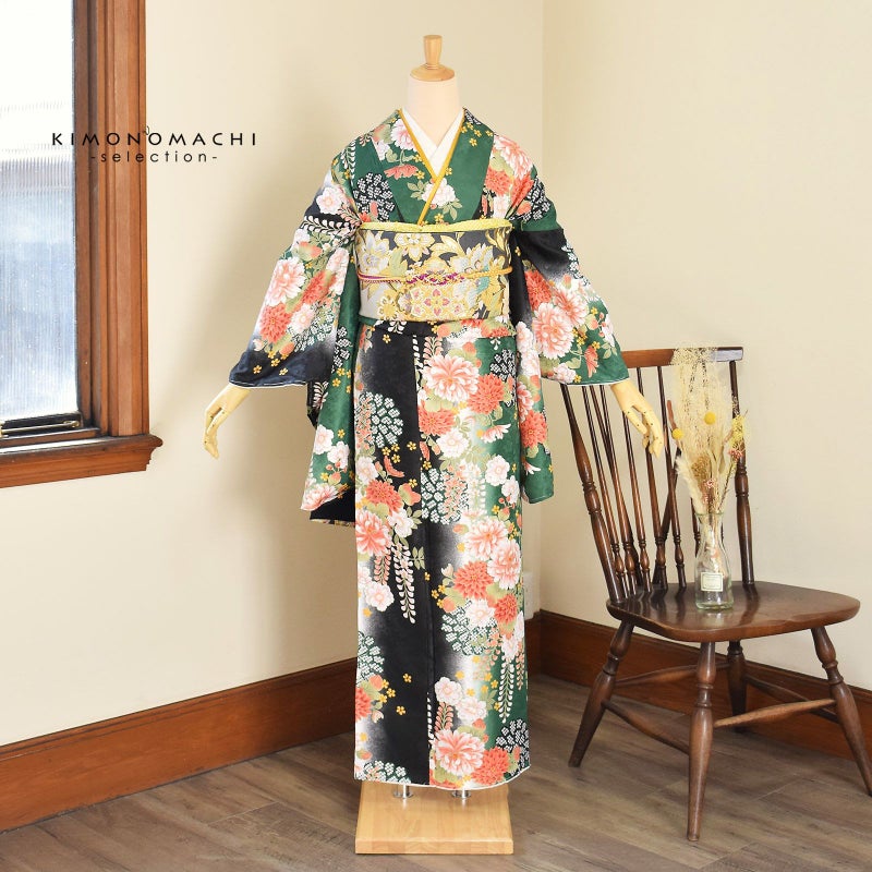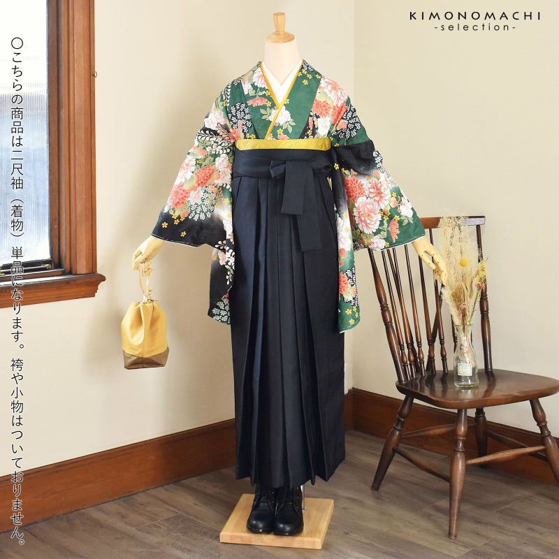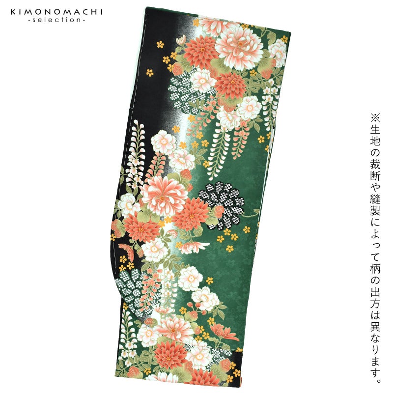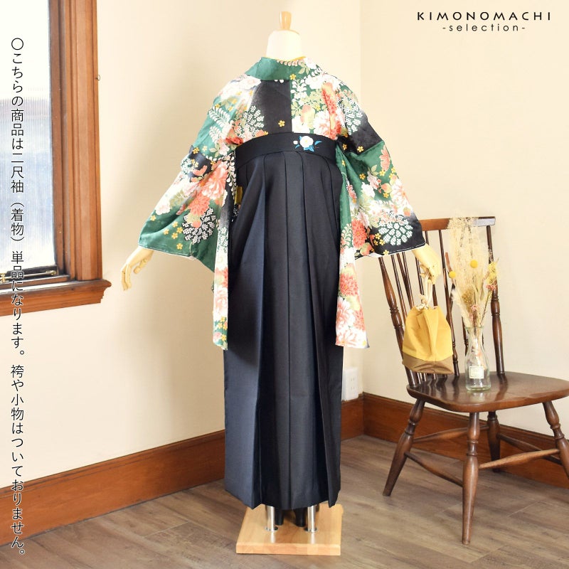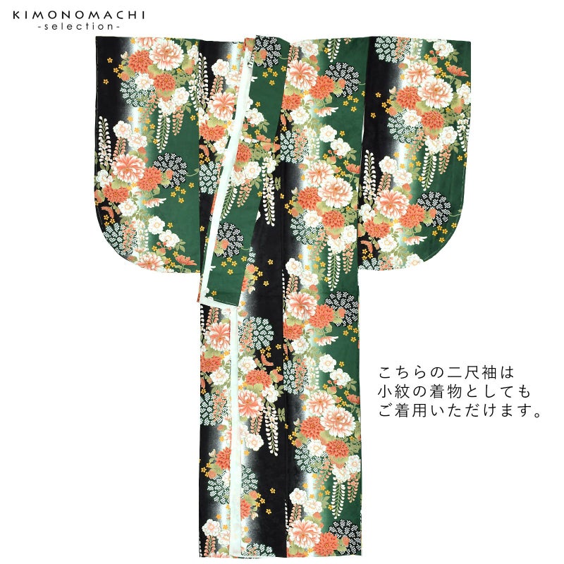 (卒業式駆け込みSALE3/19迄)二尺袖着物 単品 「緑黒ボカシ地 菊に藤」 お仕立て上がり レディース 洗える着物 二尺袖 着物 袴に合わせて 卒業式 謝恩会に 通常丈 長着 カジュアル着物 【メール便不可】<H>