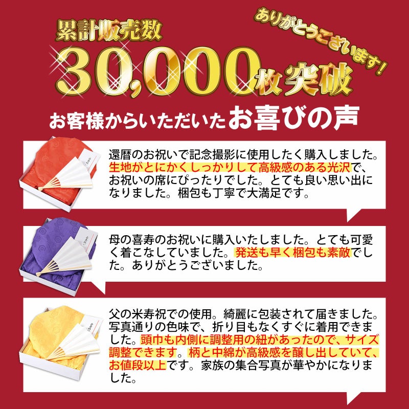 ちゃんちゃんこ、頭巾、末広、栞、化粧箱がセットになった本格お祝いセットです。