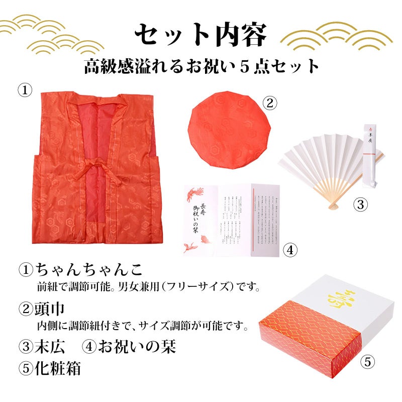 【商品内容】ちゃんちゃんこ、頭巾、末広(扇子)、栞、化粧箱の計5点