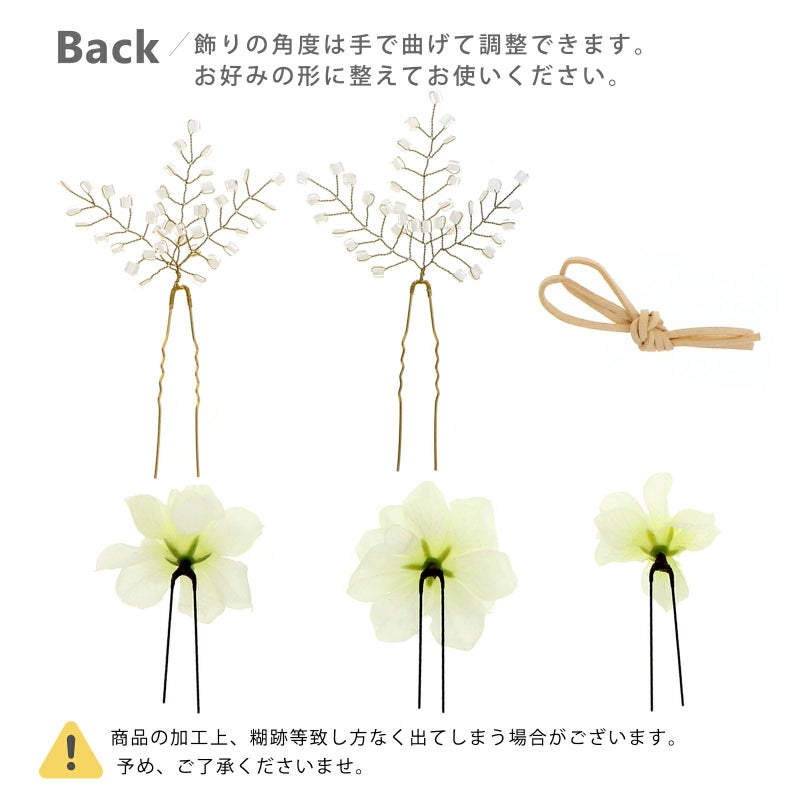 【カラー】クリームホワイトのお花のUピン3点、ゴールドに白色系のビーズの枝飾りのUピン2点、ホワイトベージュの革紐1点。素敵なデザインの化粧箱入り。