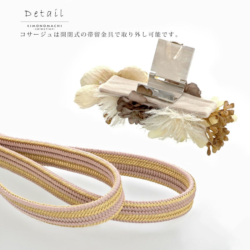 D.白茶色×金、白とグレージュのコサージュ付き…やや灰みの薄茶色と金色の幅広の帯締め。アイボリーやグレー、ベージュのお花のコサージュ帯留。コサージュは開閉式の帯留金具で取り外し可能です。