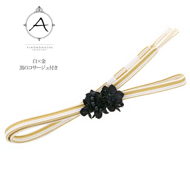 A.白×金、黒のコサージュ付き…白と金色の幅広の帯締め。黒いお花とビーズの実のコサージュ帯留。コサージュは開閉式の帯留金具で取り外し可能です。