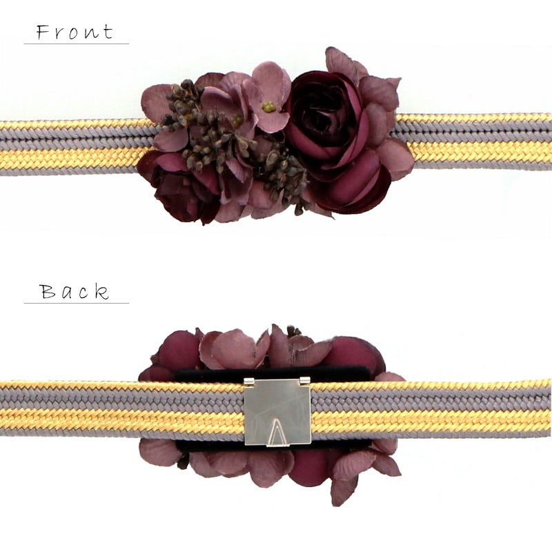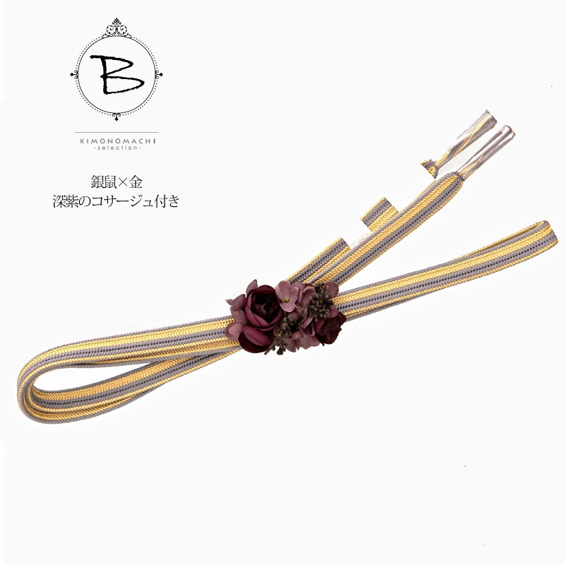 B.銀鼠×金、深紫のコサージュ付き…わずかに紫みの灰色と金色の幅広の帯締め。深い赤紫や紫紺のお花のコサージュ帯留。コサージュは開閉式の帯留金具で取り外し可能です。