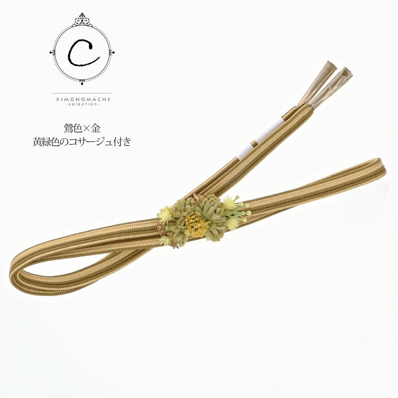 C.鶯色×金、黄緑色のコサージュ付き…やや茶色みの深い黄緑色と金色の幅広の帯締め。くすみ系の黄緑色のお花のコサージュ帯留。コサージュは開閉式の帯留金具で取り外し可能です。