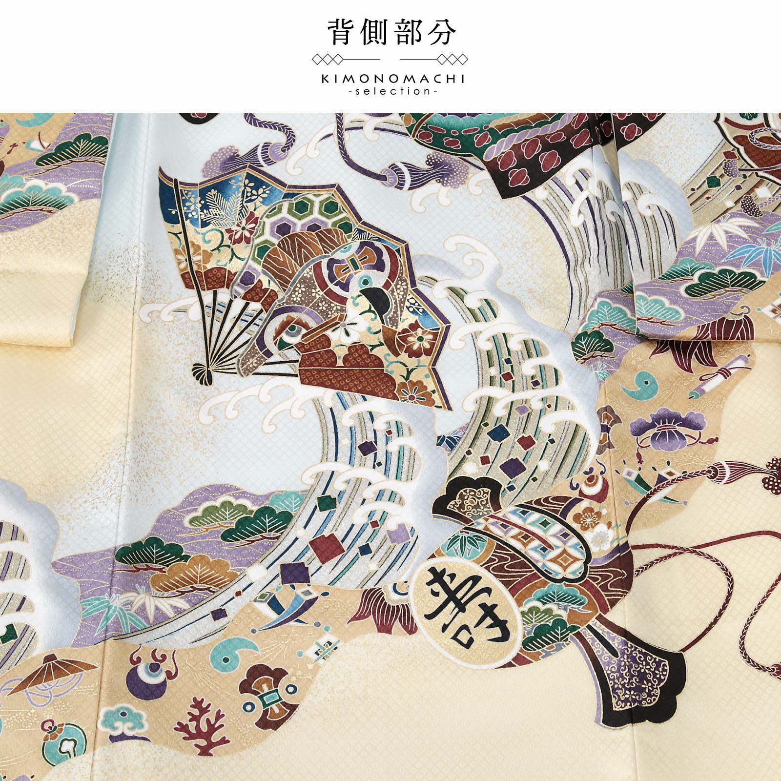 着物は疋田の地紋の白金色の地にごく淡い水色のぼかし。背には、青の龍、白、茶色に青、藤色の兜。金銀の輝きのある立浪に藤色や青磁色の宝尽くし。茶に濃紫、青、緑など多彩な色使いの扇や小槌。襦袢は白の疋田文様の地紋。袖の振りは疋田地紋の淡い水色。