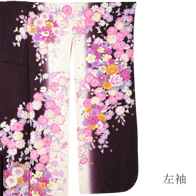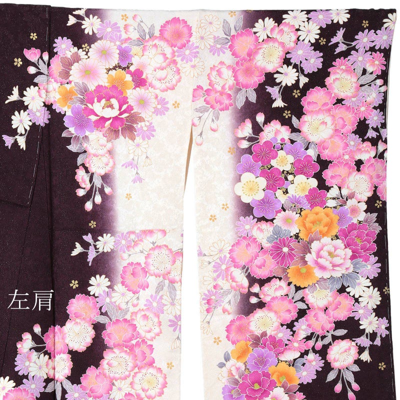 細かな地模様のある金通しの地。アイボリーと茶色みの深い赤紫色の縦ぼかし。白に赤紫色や薄紫色、ピンク、橙色の配色の牡丹に桜や菊、梅の花。上前の牡丹には金駒刺繍がほどこされています。流れを描くように表現された花々に、金の輝きが豪華で晴れやかな振袖です。オフホワイトに、ピンクの桜の柄八掛。