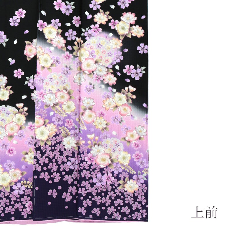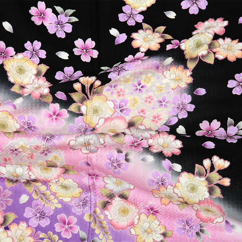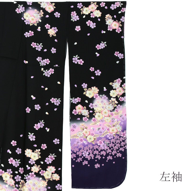 細かなドットの地模様のある黒地。裾は淡いピンクに深紫色のぼかし。全体に赤紫色系の桜花が散らされ、生成り色や淡いピンク色の辻が花調の桜に藤が表現されています。淡いグレーの雪輪の中に紫色系の小桜。絞り風の柔らかな色使いが可憐な印象です。八掛は細かな地模様のあるグレイッシュなピンク。