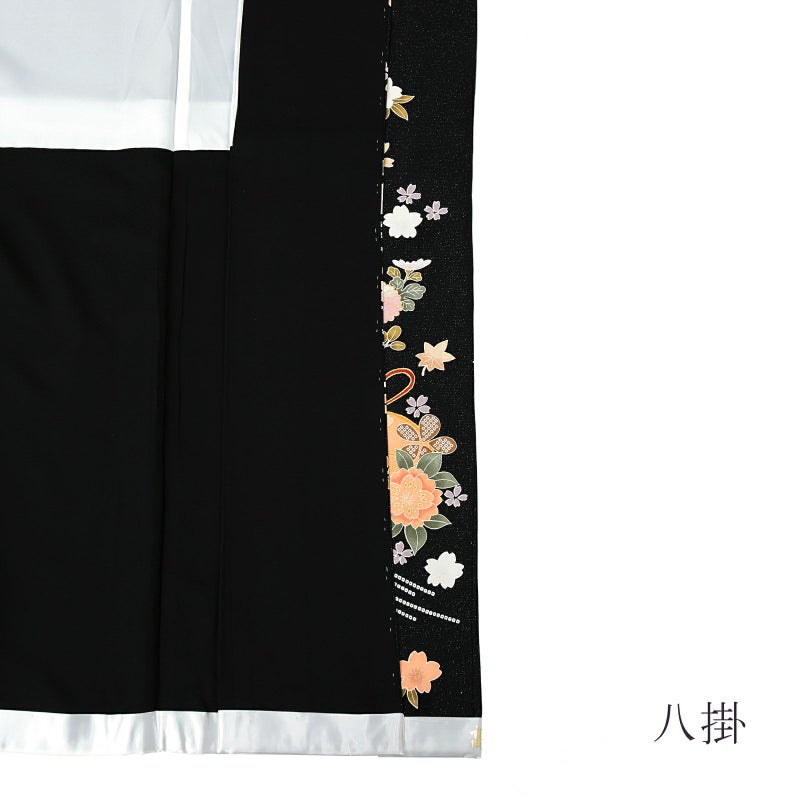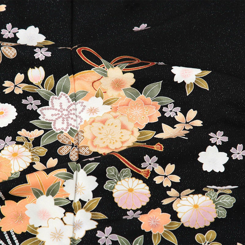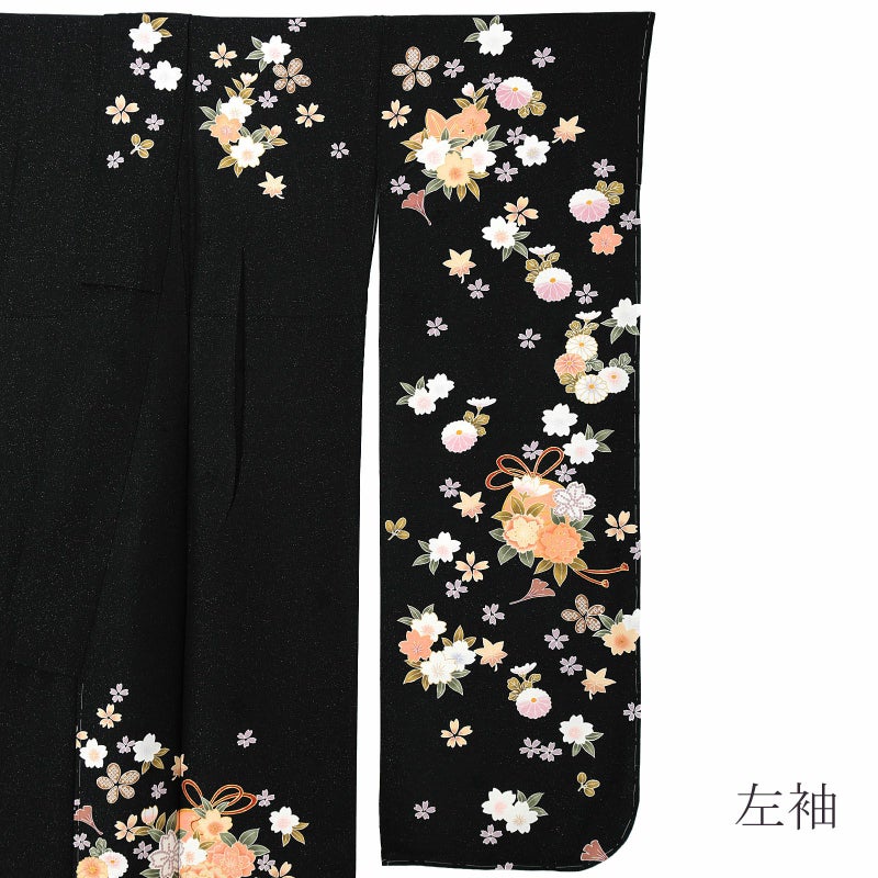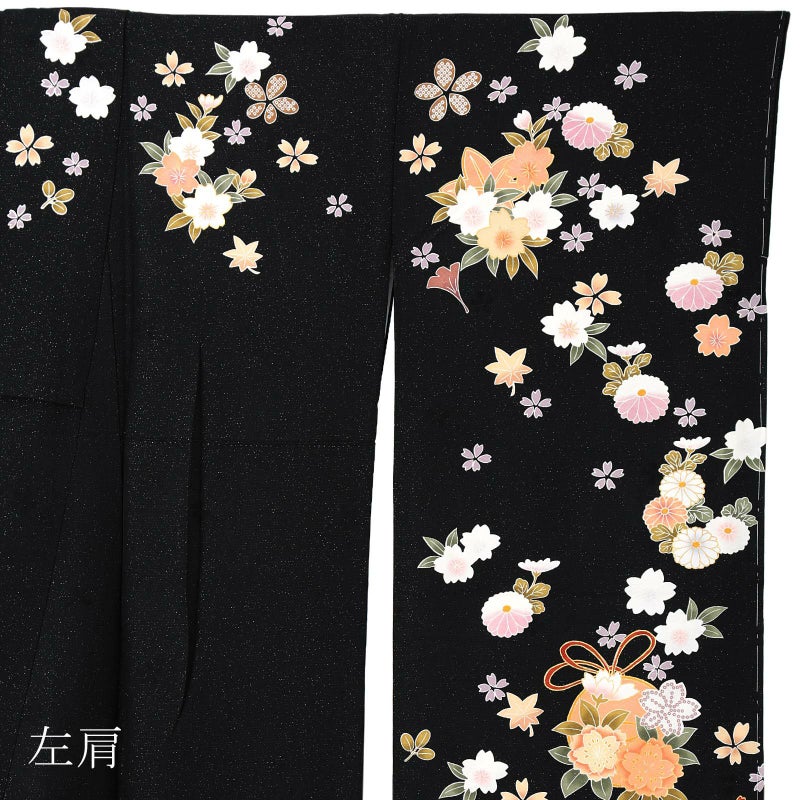 雪輪に桜の地模様のある金通しの黒地。白に淡いピンクぼかし、生成り色、薄橙色の桜や菊、楓や銀杏の葉。鈴のような組紐の付いた丸紋に桜花。裾に疋田の波模様。控えめなかわいらしさと品格のある黒の振袖です。八掛は紗綾形の地模様の黒。