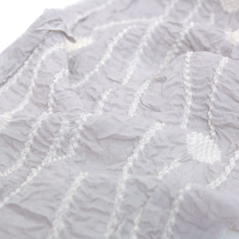 明るい薄グレーの地に白。細かな白の絞りを連ねたよろけ縞に水玉が、風に吹かれたようなふんわりとした雰囲気です。