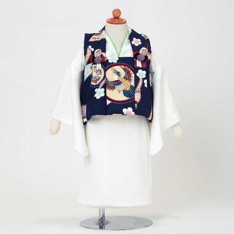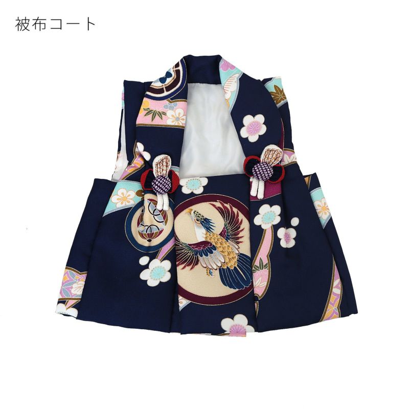 被布コートは紺地に薄ピンクや藤色、水色の雪芝文様。白い梅の花。ベージュに臙脂や紺、金茶色や緑、赤紫色の鷹、酢漿草、笠などの丸紋。砂子の金彩。つまみ細工の被布飾りが付いています。二部式の着物は白。重ね衿は紗綾形地紋の明るい黄緑色。