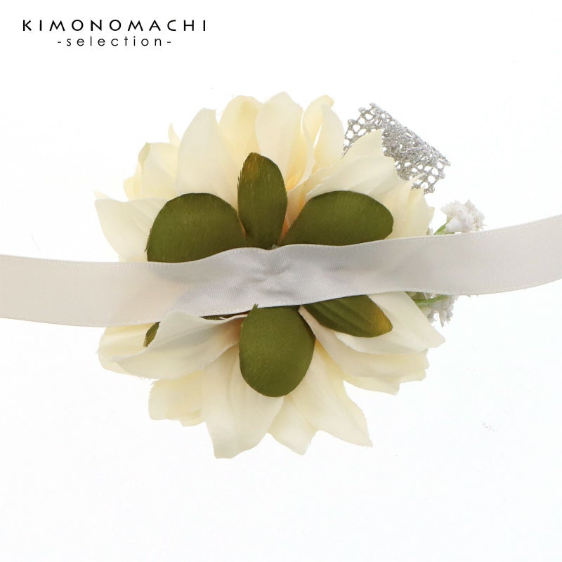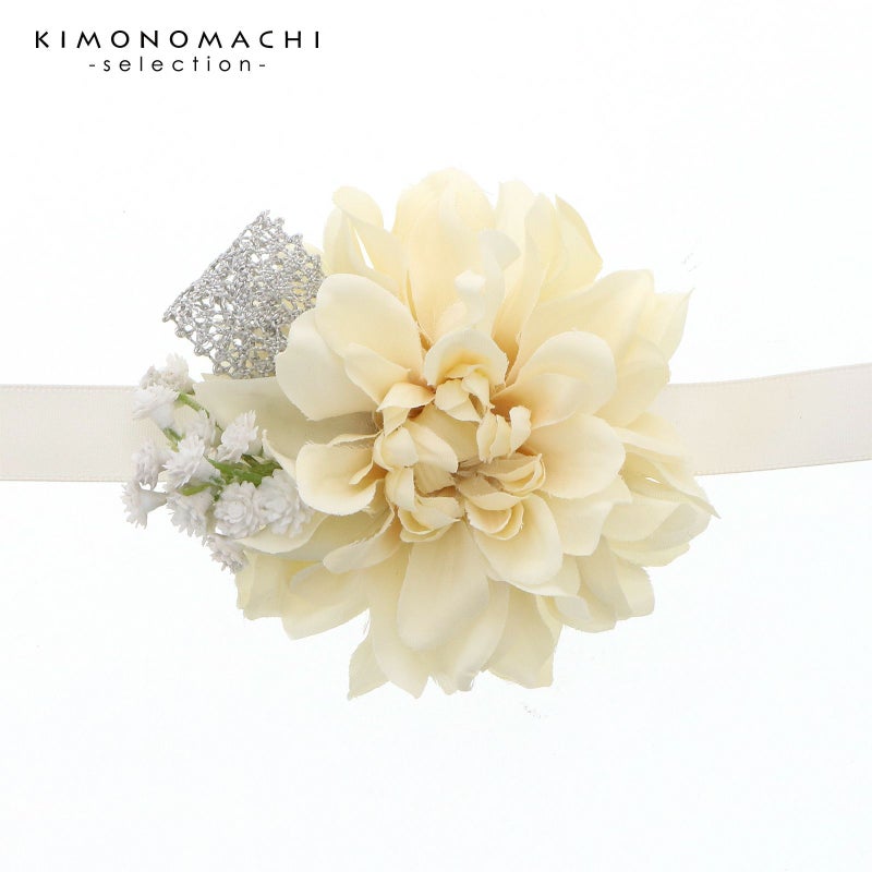 【色柄】アイボリーのサテンリボン。中央に生成り色のお花とカスミソウ、シルバーのレースリボンのコサージュ付き。