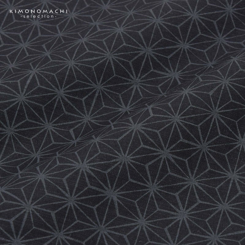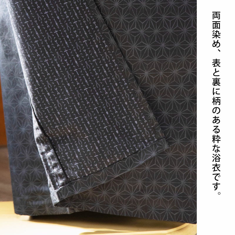 表は黒地に墨色の麻の葉模様。裏は黒地に灰色の細かな大工道具の柄。縦に配置された小さな釘や金槌、やっとこ、スパナなど。ちらりと見える裏面にこだわりのお洒落が隠された浴衣です。