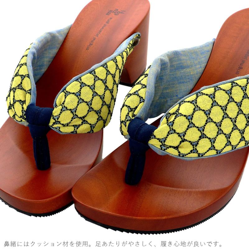 【カラー】爽やかなレモンイエローが印象的なレース生地を重ねたレイヤードタイプの鼻緒。裏地もブルーとイエローのミックスカラーなので、暑い夏でも見ているだけで涼し気な印象を与えてくれる1足です。