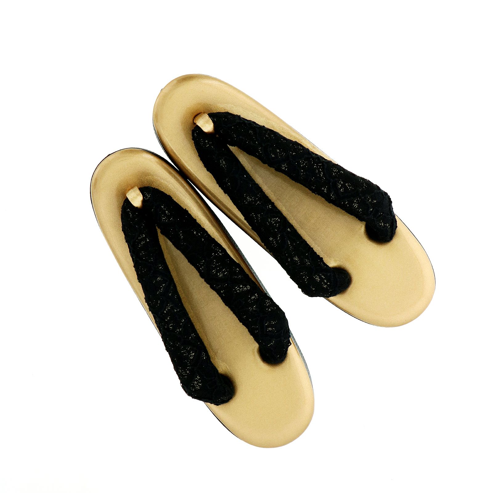 草履の鼻緒は金通しの黒のレース。前坪はゴールド。草履の台はブロンズゴールドの天に、芯の巻は型押しの入った黒。