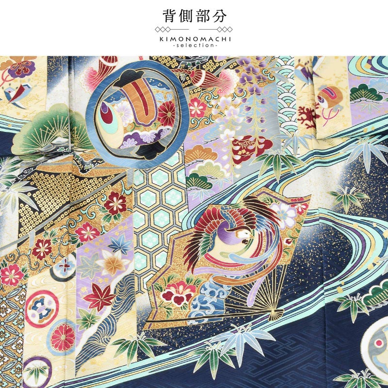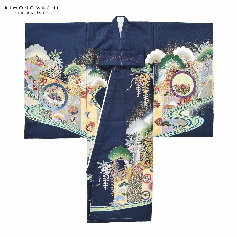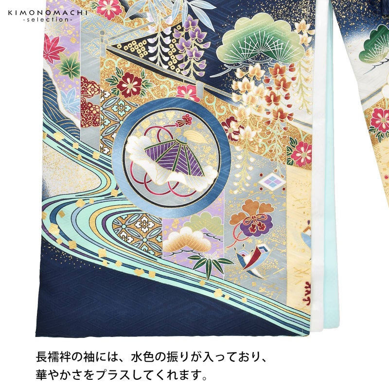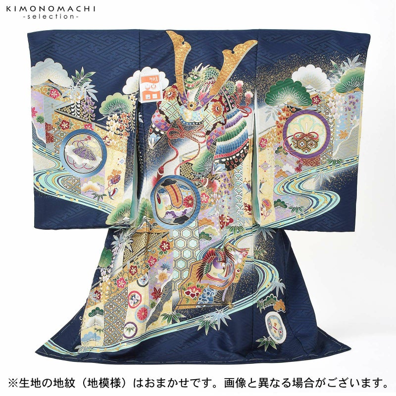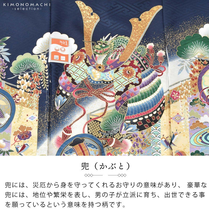 男の子らしく勇ましい、カッコイイ雰囲気。美しい発色の生地に美しい模様。長襦袢の中に水色の振りが入っており、お洒落な雰囲気をプラスしてくれます。