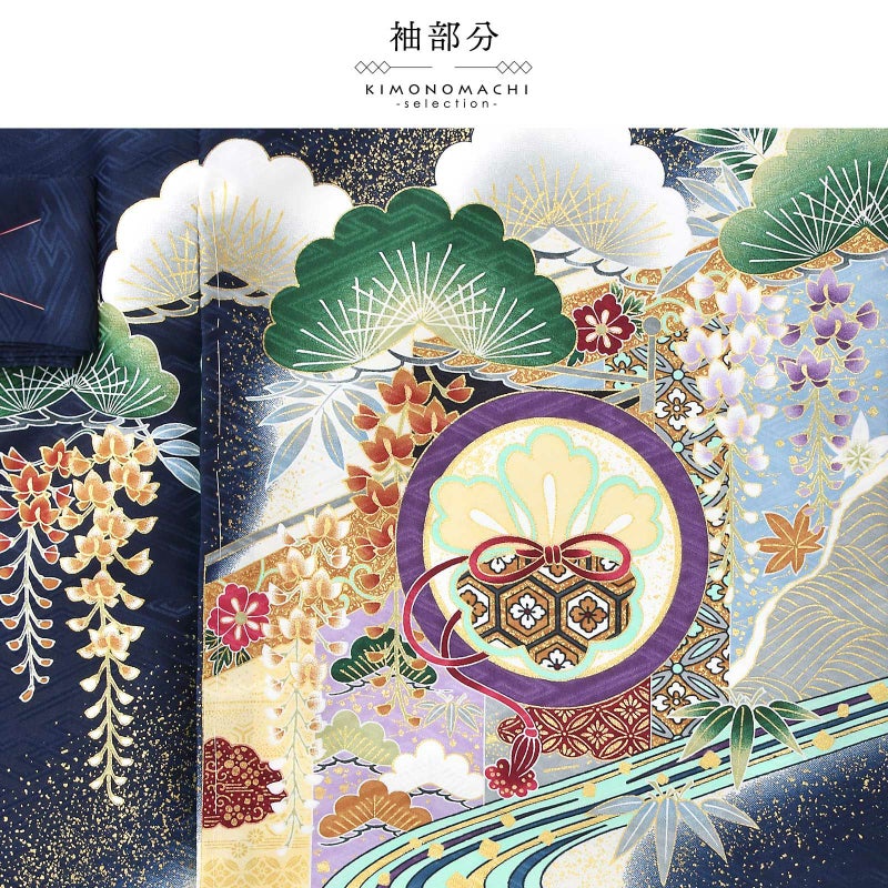 着物は紺地に白のぼかし。背には、緑の龍、白、明るい白緑色に紫、緑の兜。淡いクリーム色に薄紫、青灰色、金茶など多彩な色使いの幔幕に、松藤、扇。流水が大胆に文様を区切り、さらに宝尽くしの丸紋など、緻密な文様に金彩が上品な煌びやかさを添えています。襦袢は白。袖の振りは淡い水色。