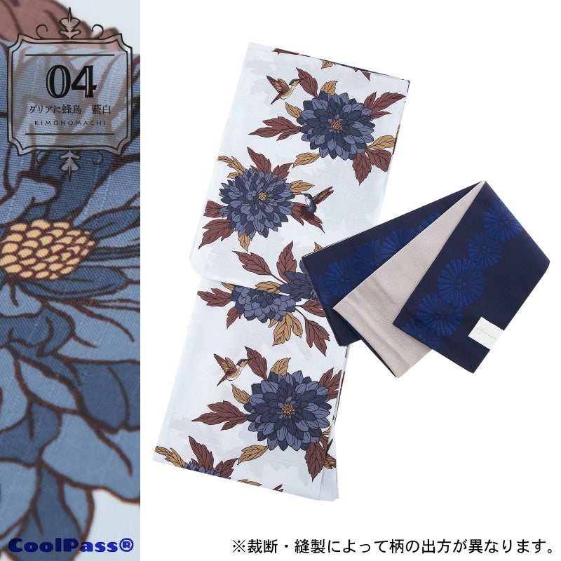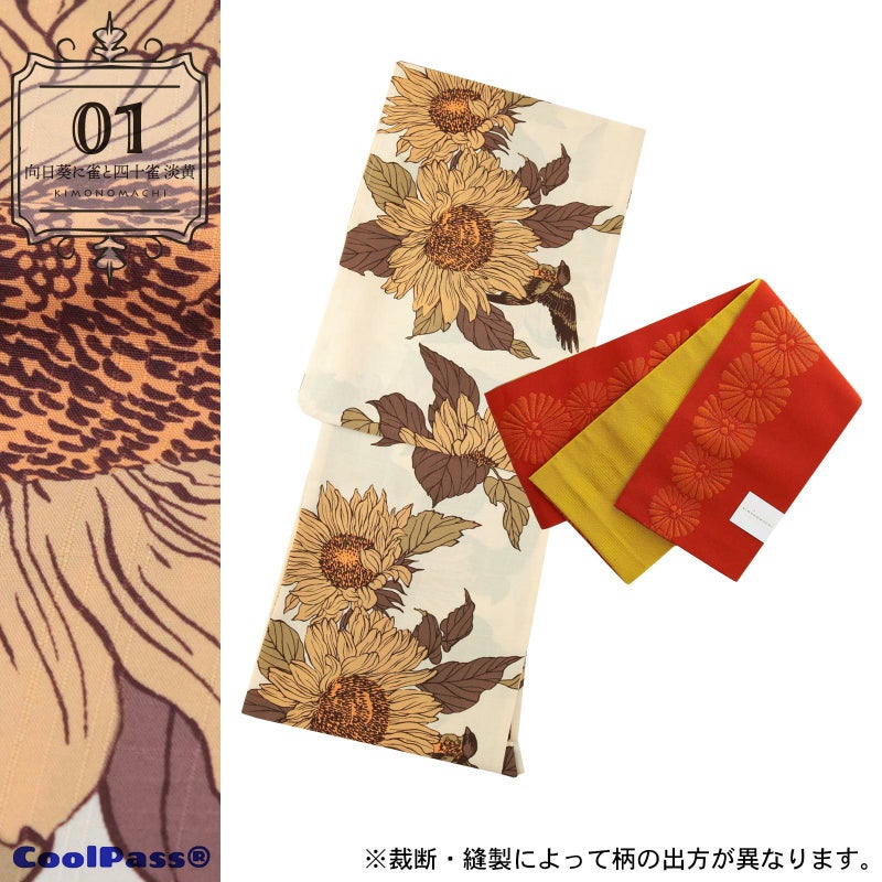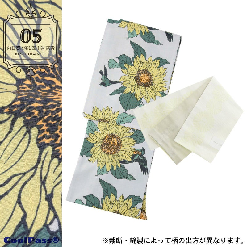 5. 浴衣 セット レディース 吸水速乾 CoolPass ポリエステル浴衣 浴衣と帯の2点セット「向日葵に雀と四十雀、夏椿に鵯、朝顔に燕、ダリアに蜂鳥」Fサイズ LLサイズ 大人 女性浴衣 半幅帯 小袋帯 個性的 花火大会 夏祭り 女性ゆかた 夏着物 単衣着物 オリジナル KIMONOMACHI 【メール便不可】ss2512ykl10