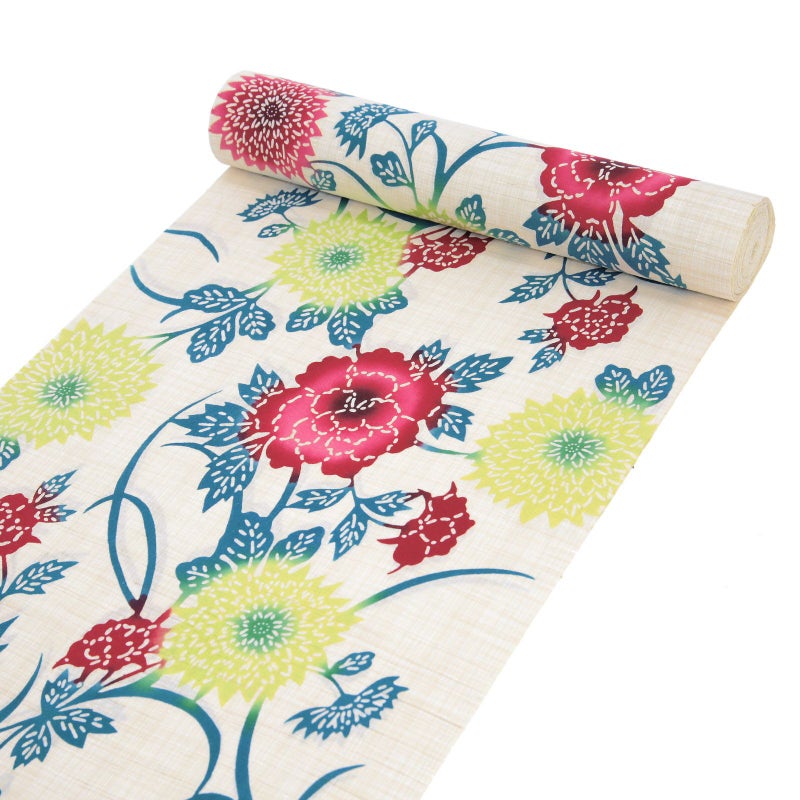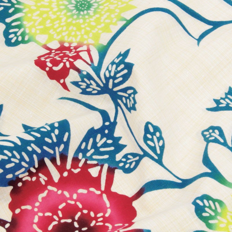 白と生成り色が交じり合った地に、臙脂に赤紫色の牡丹、黄色に黄緑の菊の花、青緑色の枝葉。花唐草風のデザインとぼかしの色の変化が魅力です。