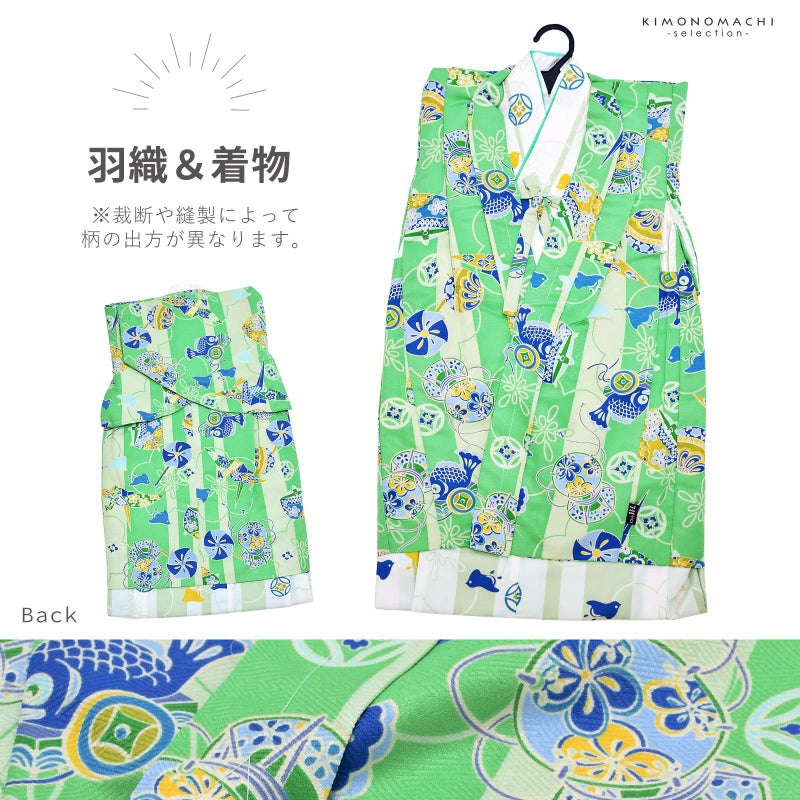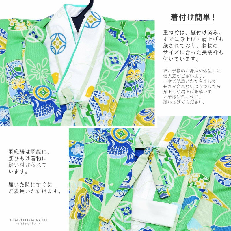 羽織は紗綾形の地模様に、薄緑、明るいグリーンの縞。その上に青、水色、薄黄色、抹茶色などの鯉車や鞠、鼓、風車などの玩具文様。着物は、白緑色の縞模様に梅の花。その上に濃い青や黄色の千鳥や七宝。あざやかな緑色の重ね衿。白の長襦袢。帯はあざやかなエメラルドグリーン。草履の鼻緒は、紺地に小槌の柄。草履の台は、畳表の天。羽織と共布の巾着。