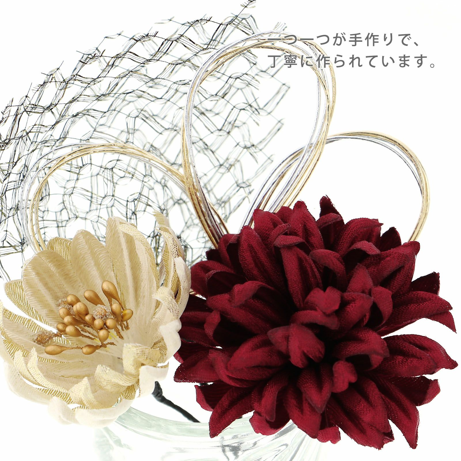 1 ダークレッド・・・光沢のあるダークレッドのマム。ゴールドベージュの花びらに金色のペップのマム。黒にゴールドのチュール飾り。金銀の三ツ輪の水引飾り。