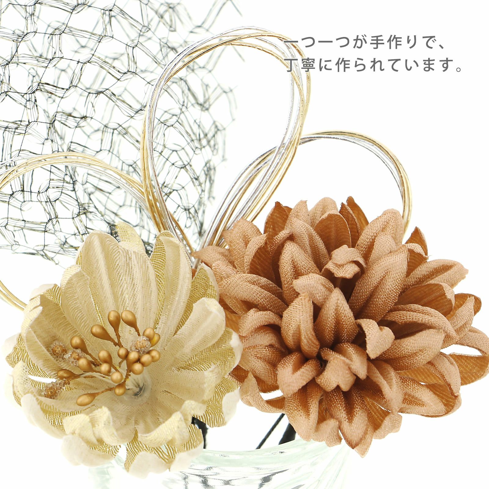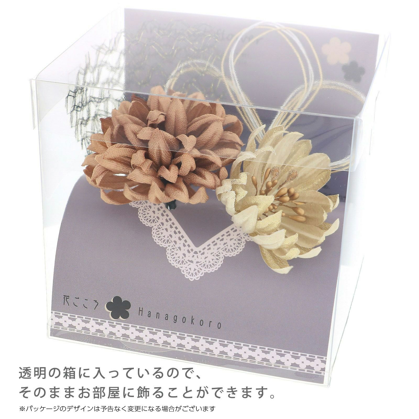 3 ゴールドベージュ・・・光沢のあるブロンズゴールドのマム。ゴールドベージュの花びらに金色のペップのマム。黒にゴールドのチュール飾り。金銀の三ツ輪の水引飾り。