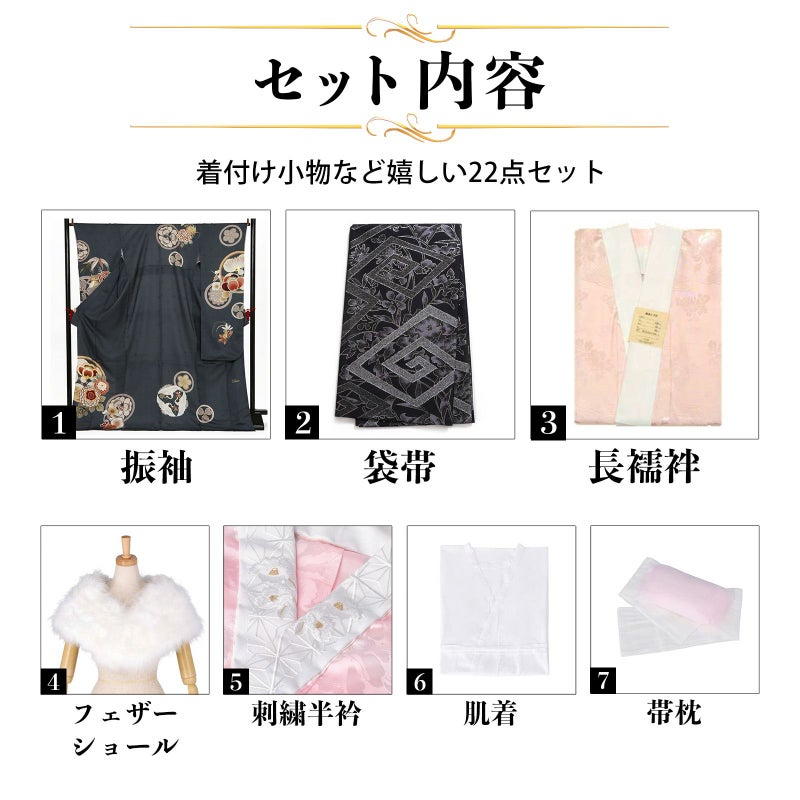 【商品内容】振袖(仮絵羽・未仕立て)、袋帯(未仕立て)、長襦袢(未仕立て)、ショール、刺繍半衿、肌着、帯枕、帯前板、帯後板、衿芯、伊達締め2本、コーリンベルト、三重仮紐、腰紐6本、足袋、着物ハンガー、振袖お仕立て、帯お仕立て、襦袢お仕立て、半衿縫い付け、胴裏正絹、長襦袢正絹の計22点セット