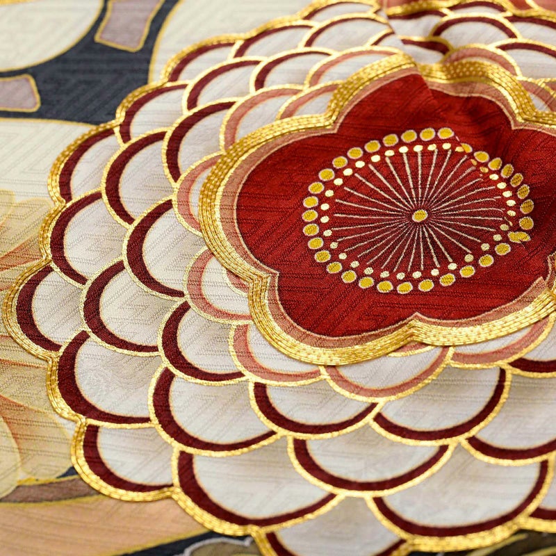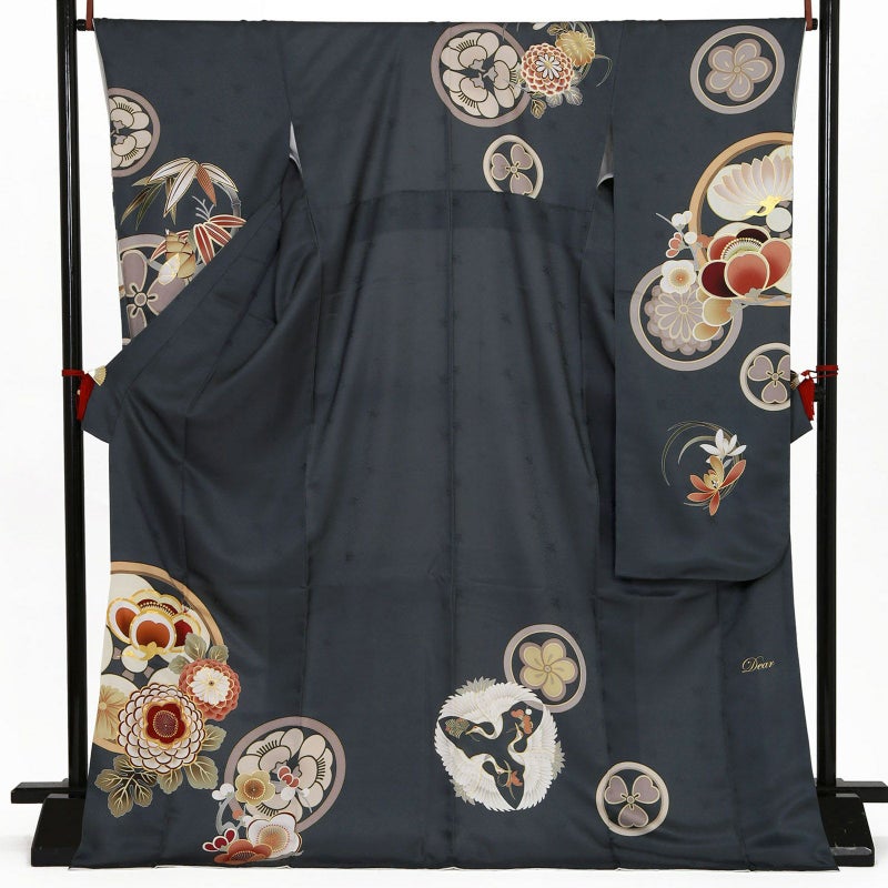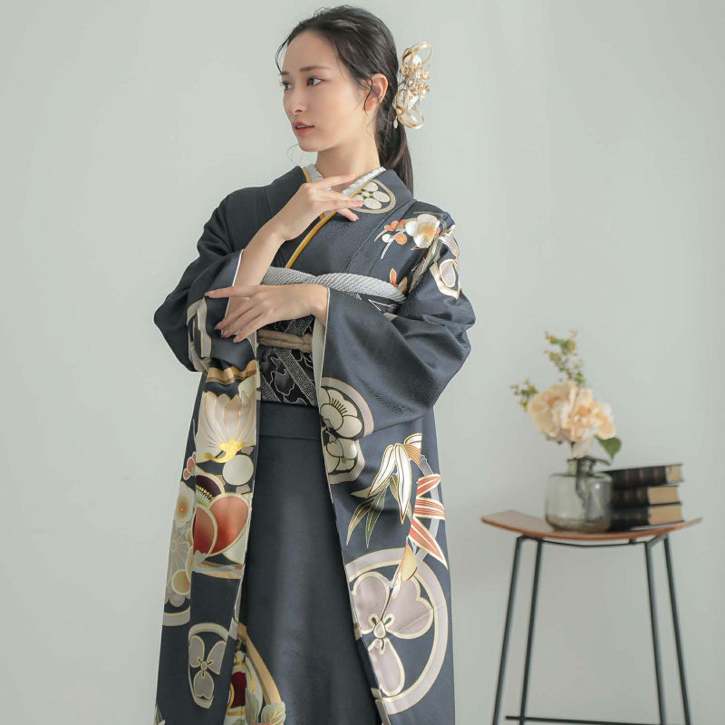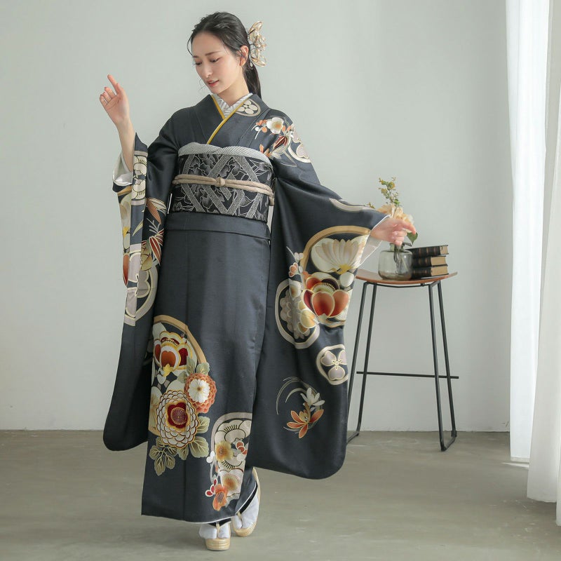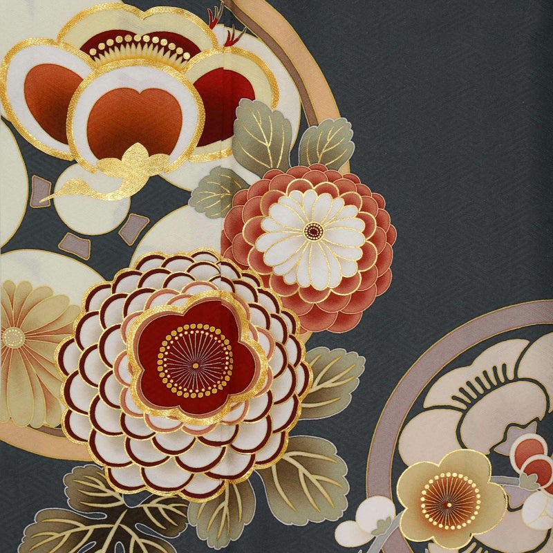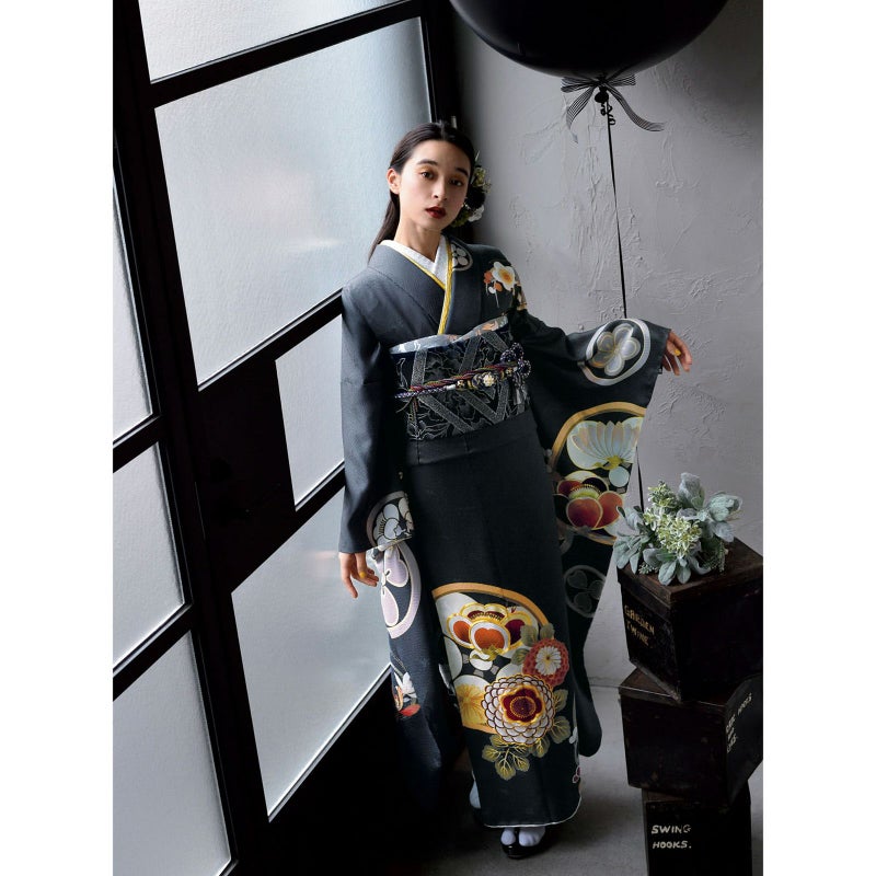 グレー地に花丸文を施した、スタイリッシュな「Dear」のお着物です。梅の模様に金駒刺繍を施すことで、シンプルながらも華やかな印象になっています。最近人気のブーツを合わせるスタイルにもピッタリです! 小物の合わせ方によって様々な雰囲気で着ていただける振袖なので、自分らしいコーディネートを楽しんでください。