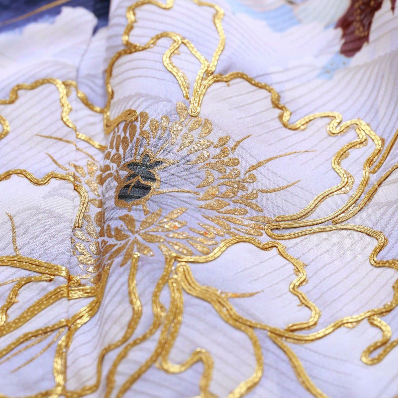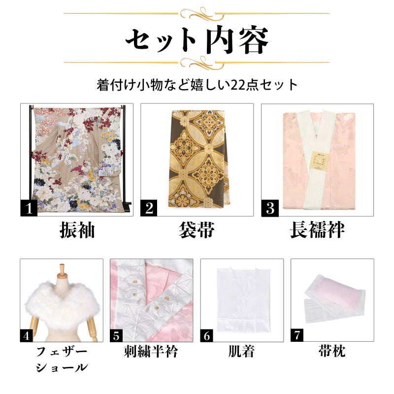 【商品内容】振袖(仮絵羽・未仕立て)、袋帯(未仕立て)、長襦袢(未仕立て)、ショール、刺繍半衿、肌着、帯枕、帯前板、帯後板、衿芯、伊達締め2本、コーリンベルト、三重仮紐、腰紐6本、足袋、着物ハンガー、振袖お仕立て、帯お仕立て、襦袢お仕立て、半衿縫い付け、胴裏正絹、長襦袢正絹の計22点セット