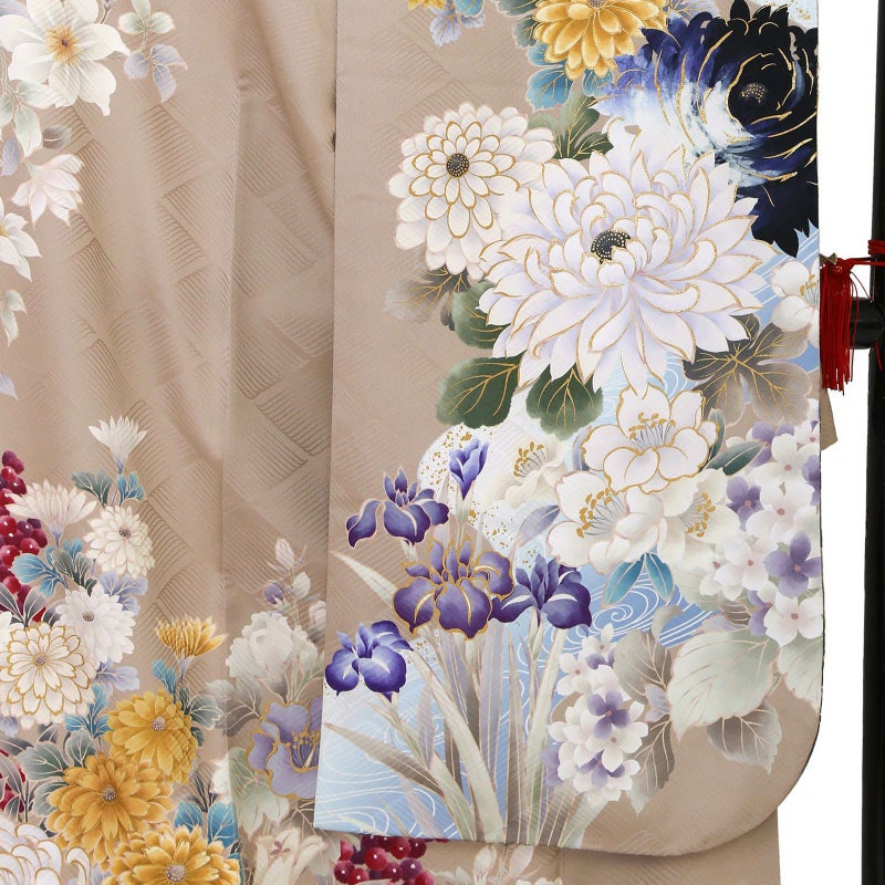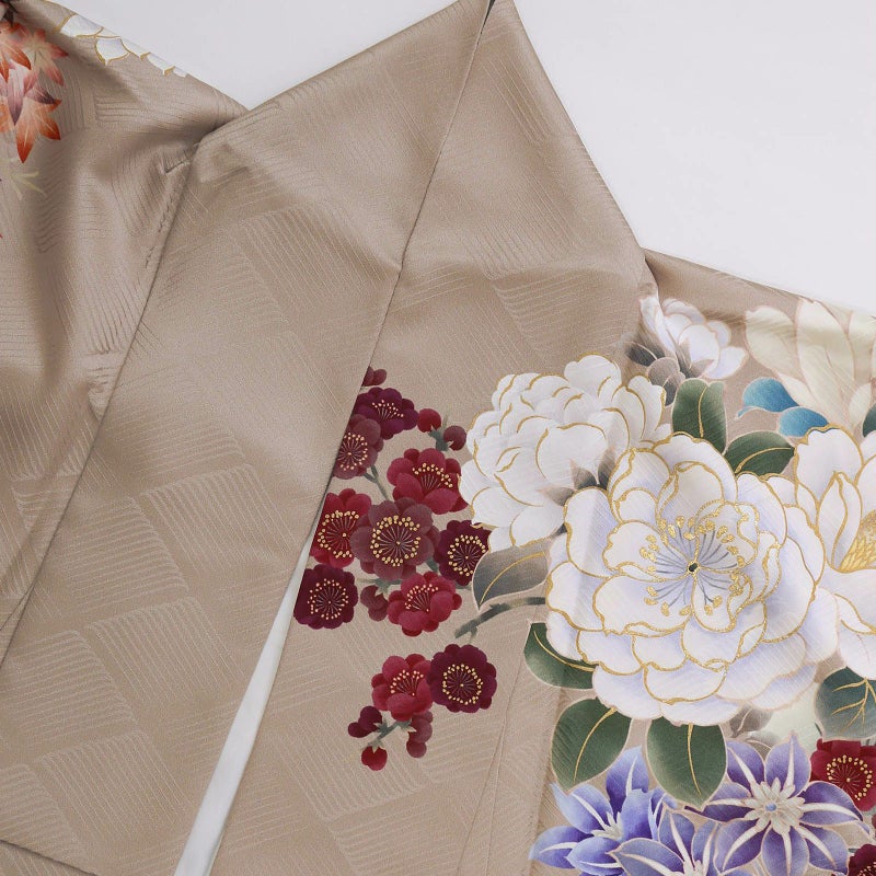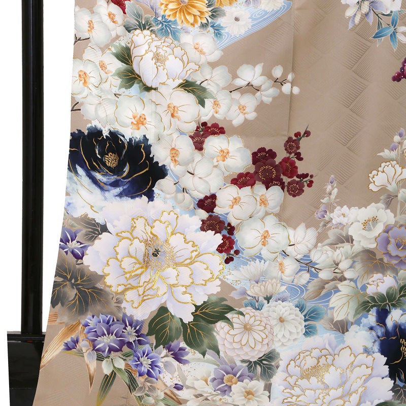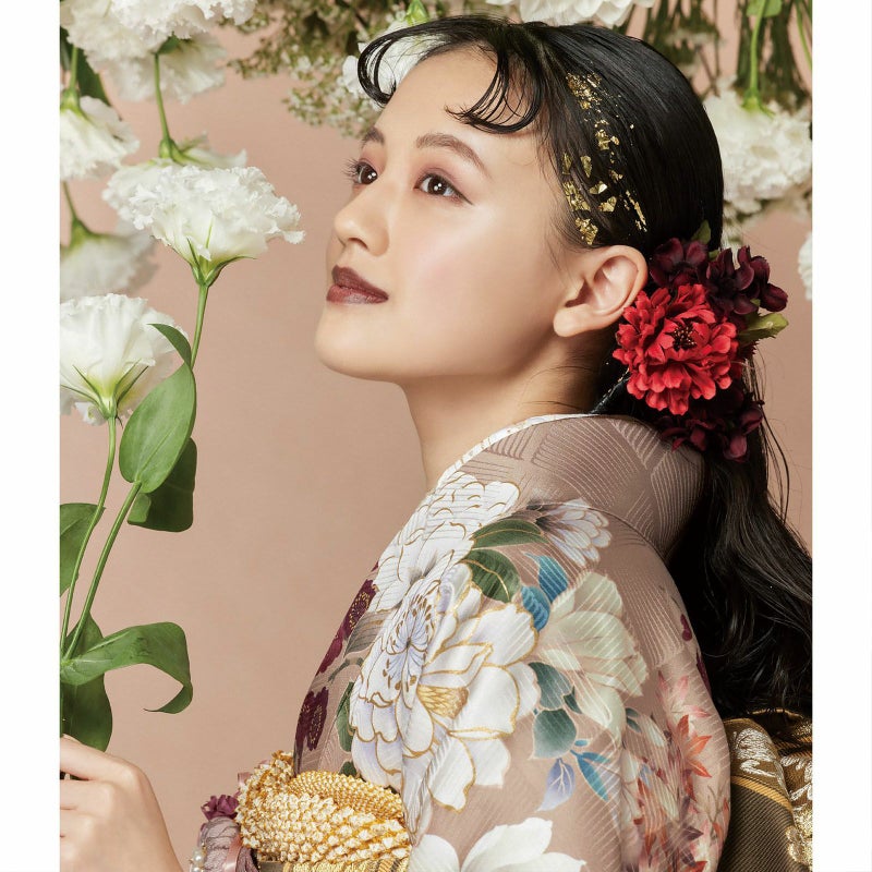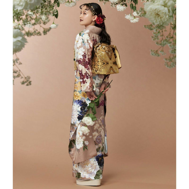 人気のベージュ色をベースに、牡丹や胡蝶蘭・四季折々の花々を描いた振袖。華やかな柄ながら、水彩画のような滲みと淡い色使いが、優しい雰囲気となっています。帯には黒と金のシンプルなものを合わせ、振袖が際立つコーディネートにしました。淡色好きさんにおすすめな振袖です!