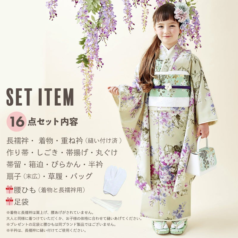 【商品内容】長襦袢・着物・重ね衿(縫い付け済)・作り帯・しごき・帯揚げ・帯締め(丸ぐけ)・帯留め・箱迫・びらかん・半衿・扇子(末広)・草履・バッグ・足袋(プレゼント)・腰ひも3本(プレゼント)の計16点