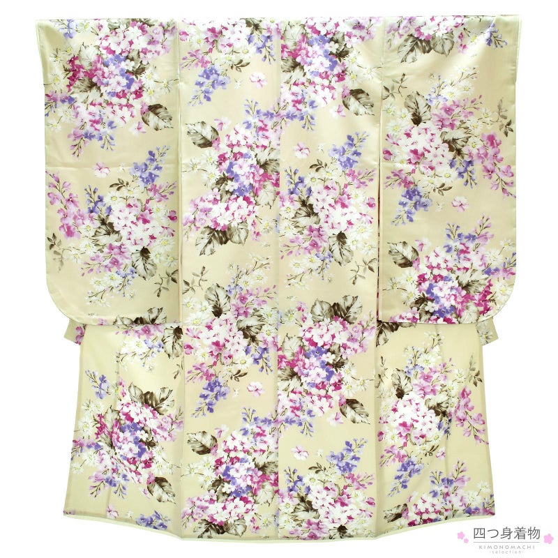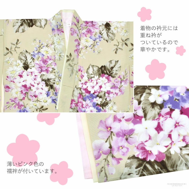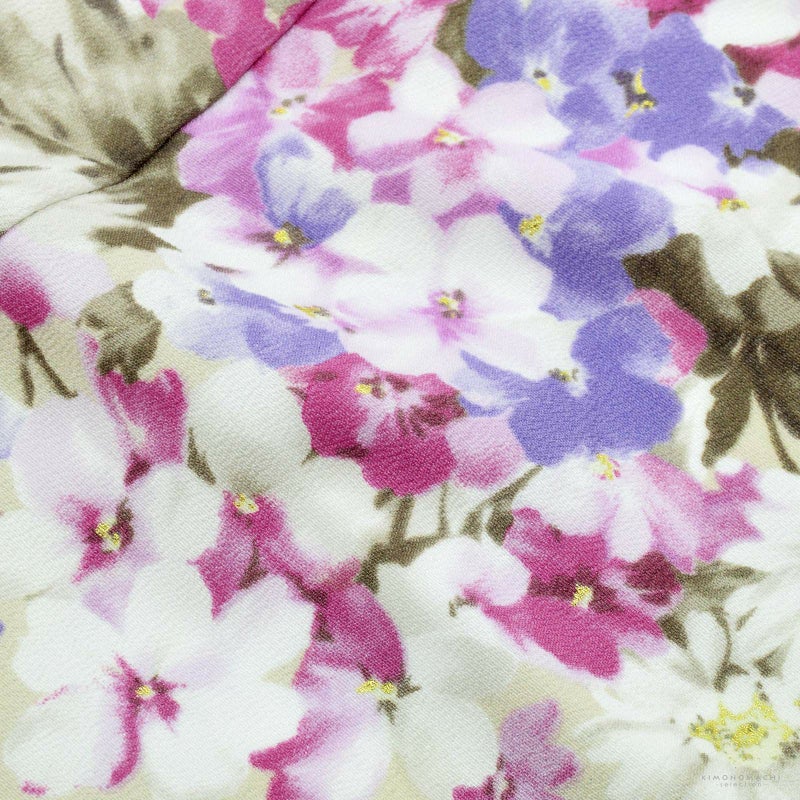 ベージュの地に白、赤紫色、青紫色、白のスミレやマーガレットなどの花々に深緑色の葉のブーケ。ポイントにゴールド。重ね衿は淡いクリーム色。長襦袢は薄ピンク。