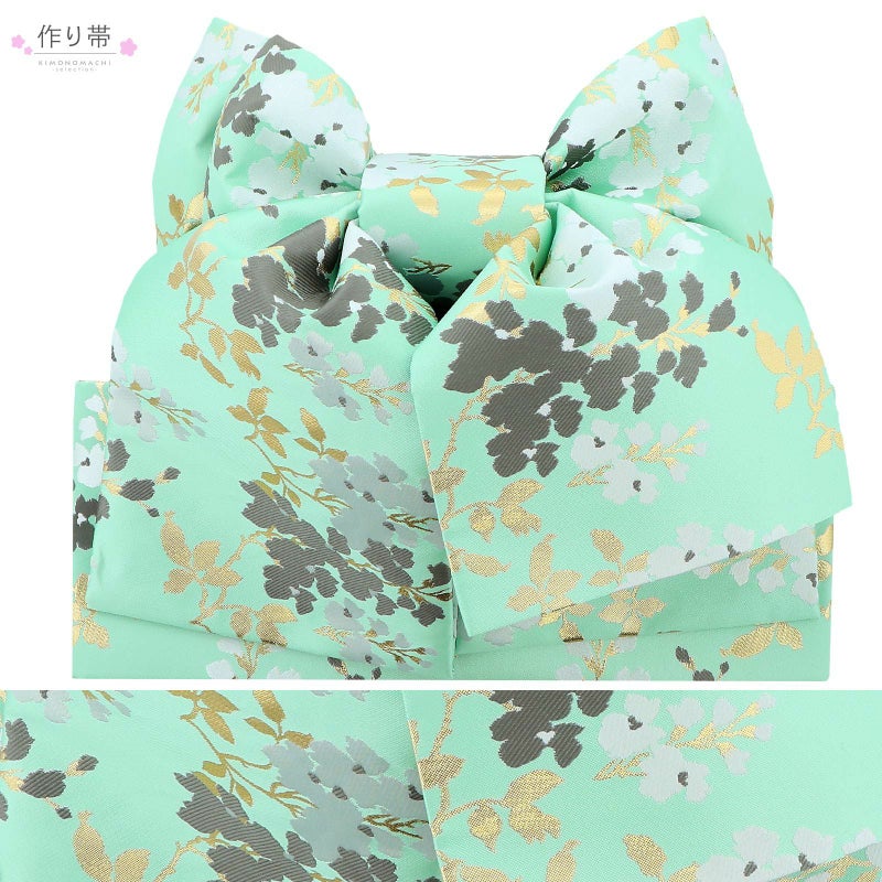 作り帯は、明るいミントグリーンの地。ゴールドの枝葉に白やグレーのお花が織り出された帯。