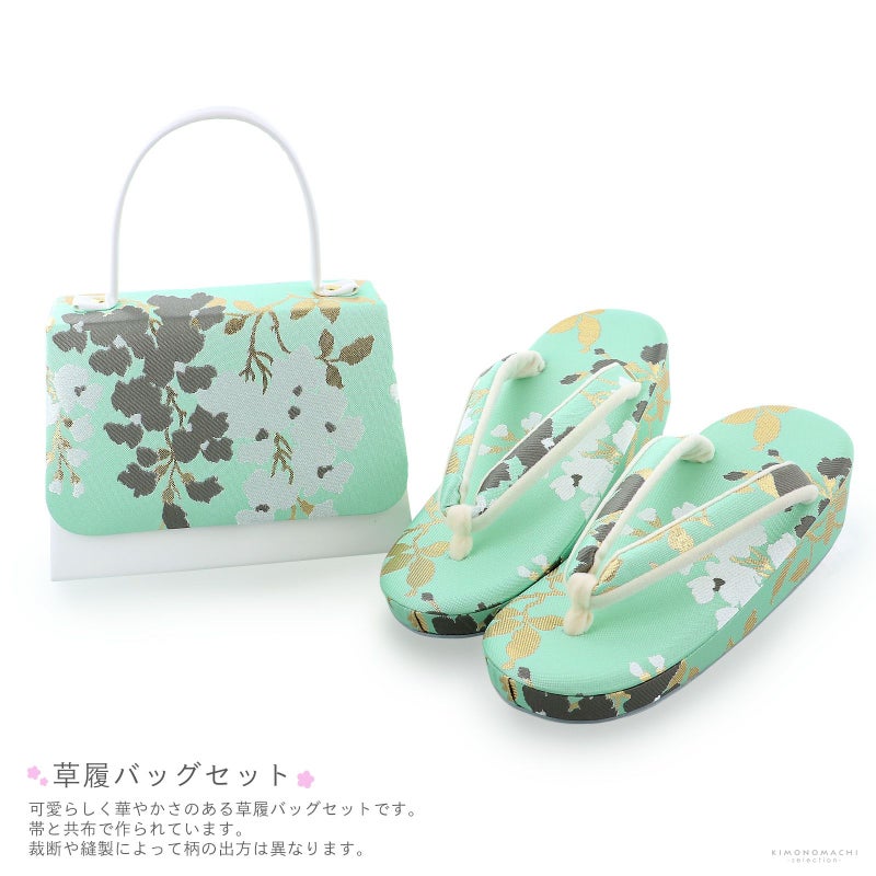 草履とバッグの蓋は、明るいミントグリーンの地にゴールドの枝葉、白やグレーのお花柄。バッグの持ち手や本体はオフホワイト。