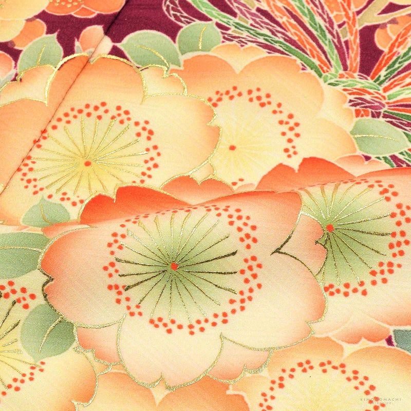 紗綾形の地模様のある深い赤紫色の地。薄緑の松に、橙色を基調とした淡い黄、金茶、水色の菊や桜、梅、楓など四季折々の草花を五色の糸で飾ったくす玉文様。扇や鼓。ポイントの金彩が格調高く華やかさを添えます。重ね衿はベージュ色。薄ピンクの長襦袢。