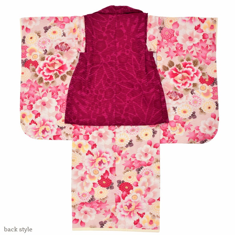 被布コートは梅の地模様のある深い赤紫色の地。被布飾りは白やピンクのつまみのお花に房飾り。着物は淡いピンク色の地に、白やクリーム色、赤色の牡丹の花、菊、椿、赤紫色の楓の葉。ポイントにゴールド。重ね衿は淡いクリーム色。被布と共生地の巾着、草履は被布と共生地の鼻緒に薄ピンクの台。ピンクや白のつまみのお花に銀のビラカンの髪飾り。