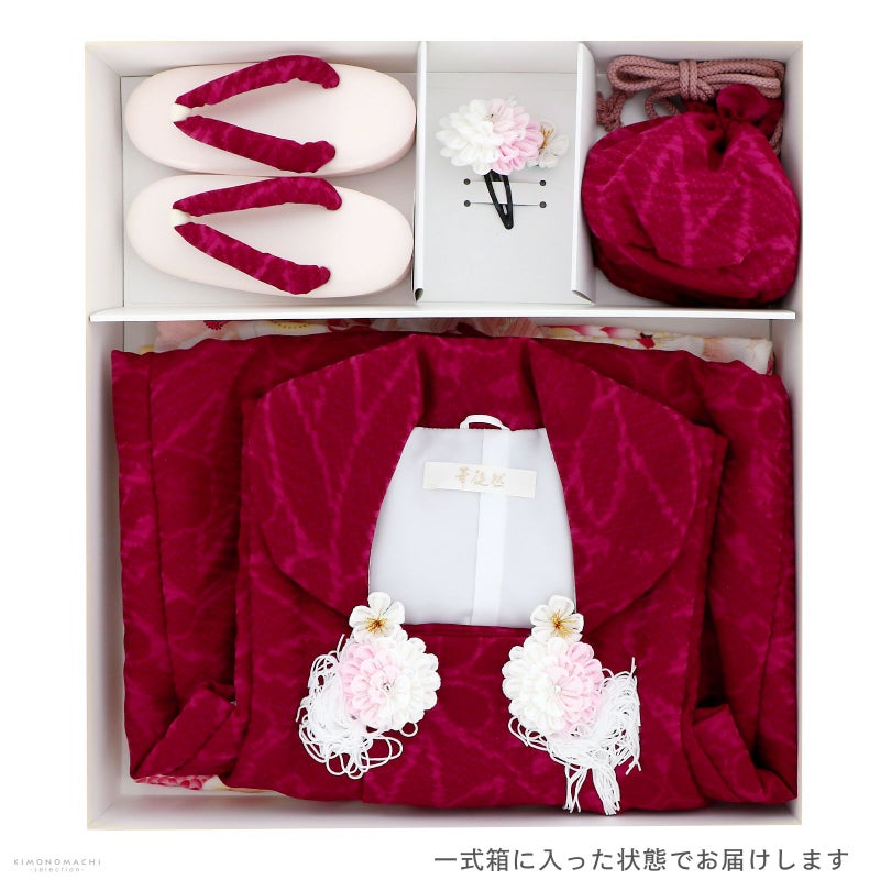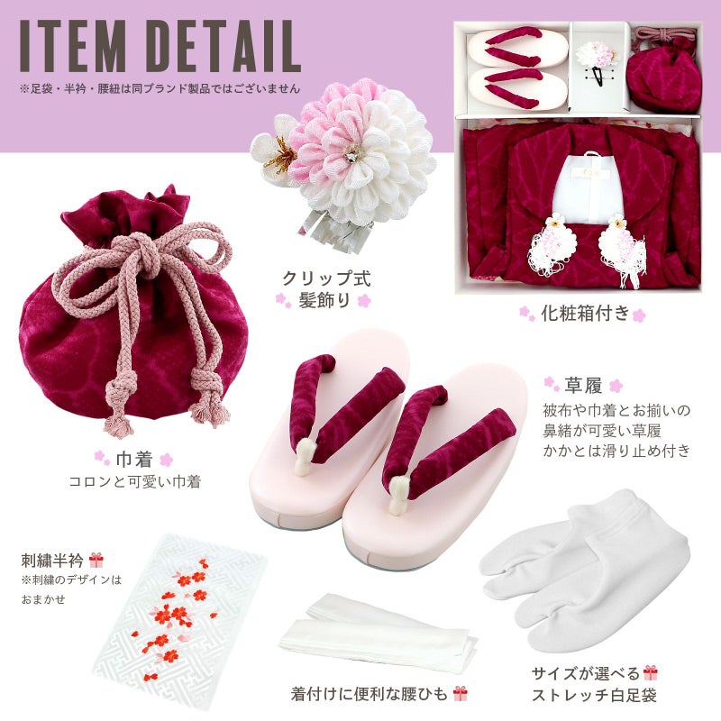 【商品内容】長襦袢・着物・重ね衿(縫い付け済)・被布コート・巾着・草履・髪飾り・刺繍半襟(プレゼント)・足袋(プレゼント)・腰ひも2本(プレゼント)の計10点