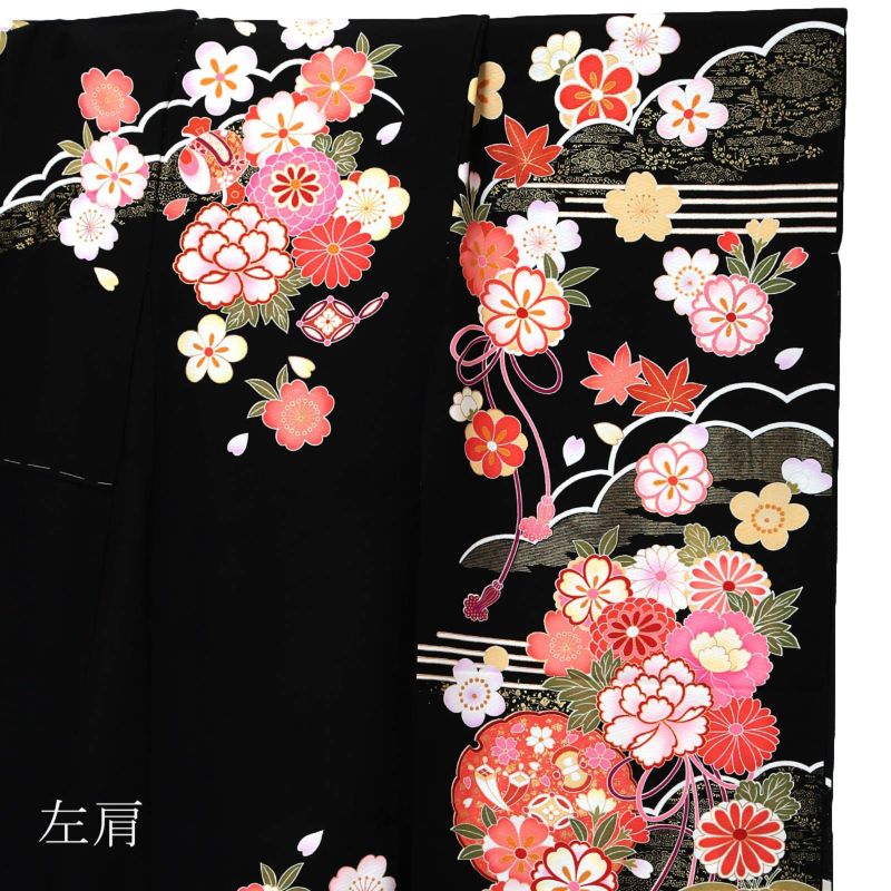 桜の地模様の黒地。白の遠山霞に赤の疋田、淡いピンクや薄黄色の雪輪、手毬。牡丹、菊や桜の花紋、宝尽くし。ピンクやサーモン色などやわらかい色合いに、金箔が力強い華やかさを演出します。八掛は小桜の地模様の深い赤。