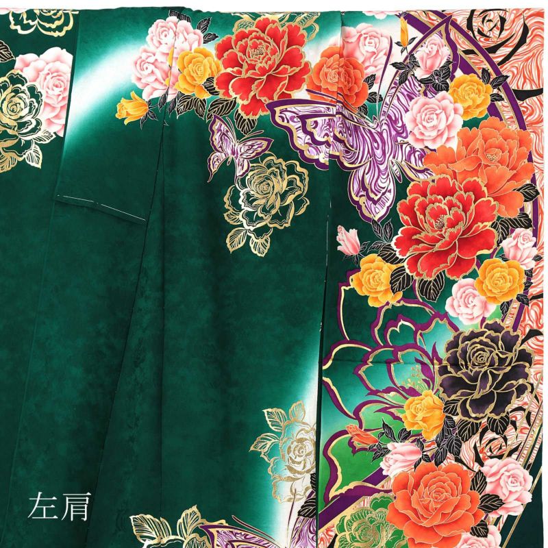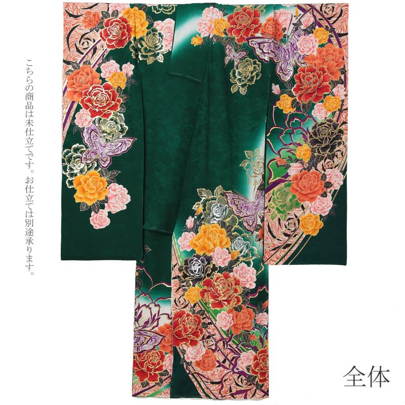 成人式や結婚式などに 華やかな未仕立て振袖単品 (卒業式応援Point10倍1/22迄)未仕立て 振袖 単品 「深緑色 薔薇と蝶」 仮絵羽 振り袖 正絹 着物 レディース 成人式 結婚式 結納 パーティー 晴れ着 【メール便不可】