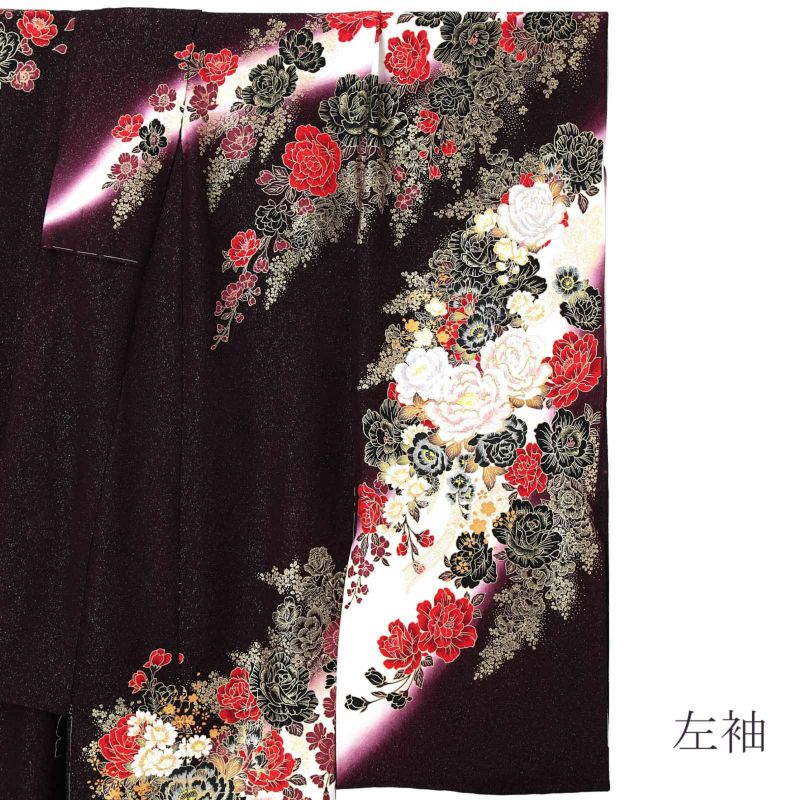 金通しに花の地模様のある黒みの紫地。袖や裾に淡い紫、黄色、白のぼかし。白にピンク、藤色など花びらの牡丹に、黒、赤、暗紅色の牡丹や桜の花模様。ラメ感のある金彩が豪華さを添えています。八掛は白の小桜の地模様。