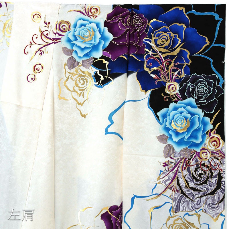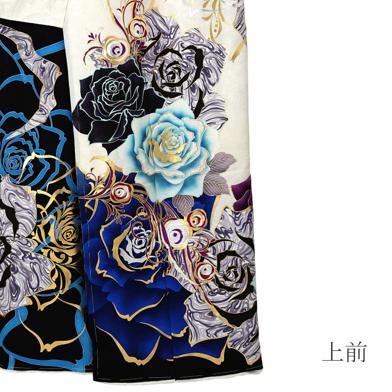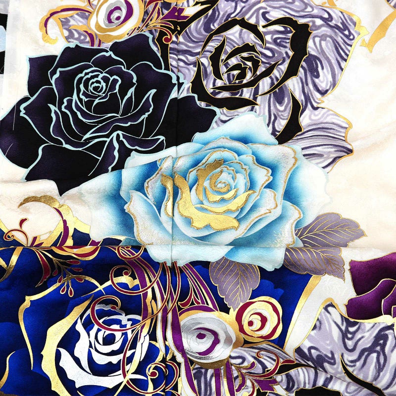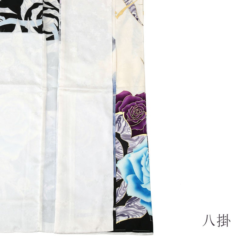花の地模様のあるオフホワイトの地。肩、裾は黒。抽象的なデザインの大きな薔薇の花、鮮やかなブルーや水色、白とくすんだ紫のマーブル模様、鮮やかな紫、金彩、銀彩の大小の薔薇の花模様。八掛は花の地模様のある白。