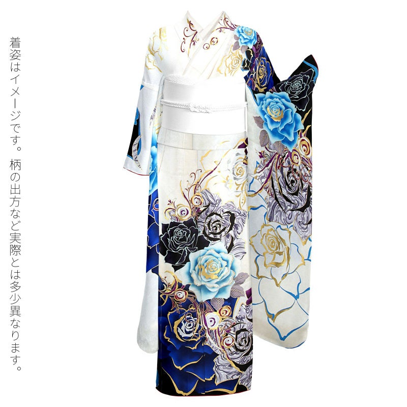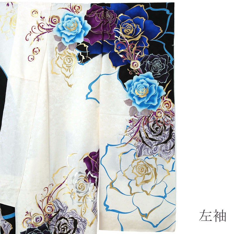 成人式や結婚式などに 華やかな未仕立て振袖単品 (卒業式応援Point10倍 3/5迄)未仕立て 振袖 単品 「白×黒 青薔薇」 仮絵羽 振り袖 正絹 丹後ちりめん 着物 レディース 成人式 結婚式 結納 パーティー 晴れ着 【メール便不可】