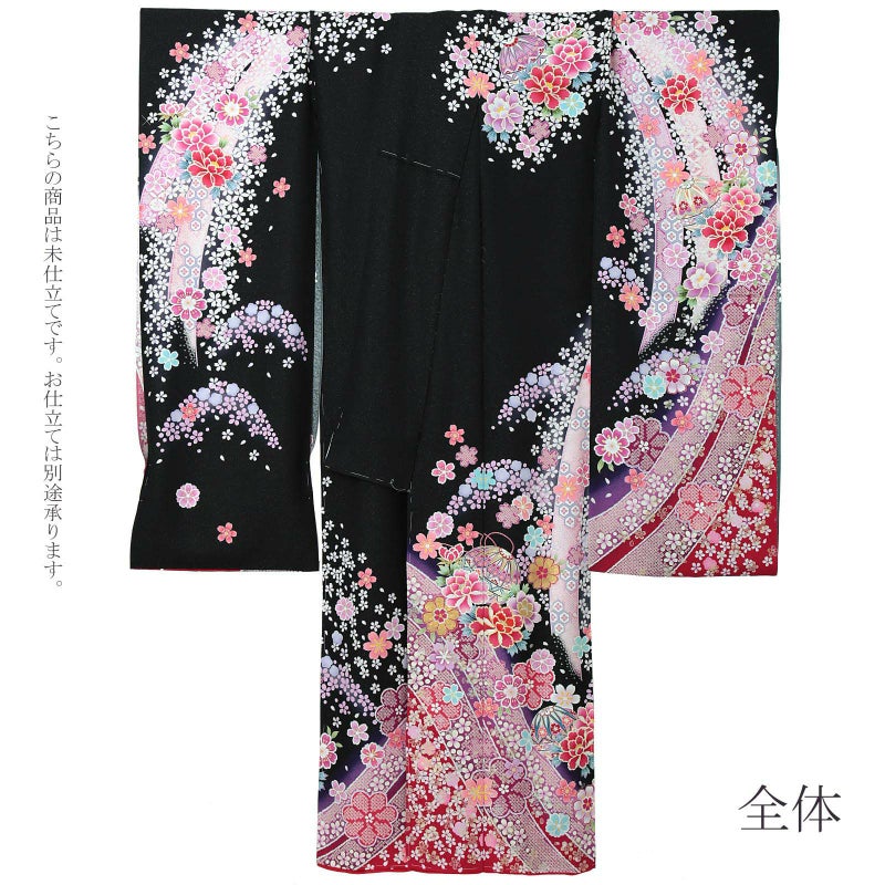 成人式や結婚式などに 華やかな未仕立て振袖単品 (卒業式応援Point10倍 3/5迄)未仕立て 振袖 単品 「黒地 熨斗に桜、牡丹に手毬」 仮絵羽 振り袖 正絹 着物 レディース 成人式 結婚式 結納 パーティー 晴れ着 【メール便不可】