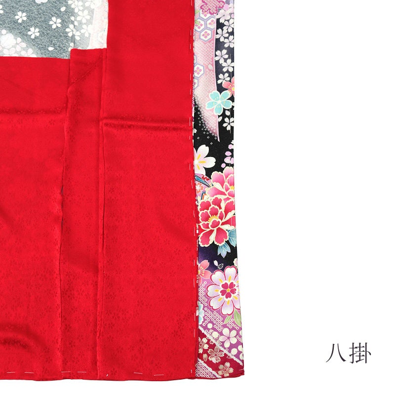金通しに細かな地模様のある黒地。裾は深い赤。淡いピンクや藤色の熨斗に小桜、牡丹に手毬。ポイントの金彩やラメ、刺繍が細やかで煌びやかな雰囲気です。八掛は赤の小桜の地模様。