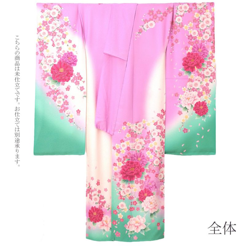 5. (卒業式応援Point10倍1/22迄)未仕立て 振袖 単品 「ピンク×ミントグリーン 牡丹」 仮絵羽 振り袖 正絹 着物 レディース 成人式 結婚式 結納 パーティー 晴れ着 【メール便不可】