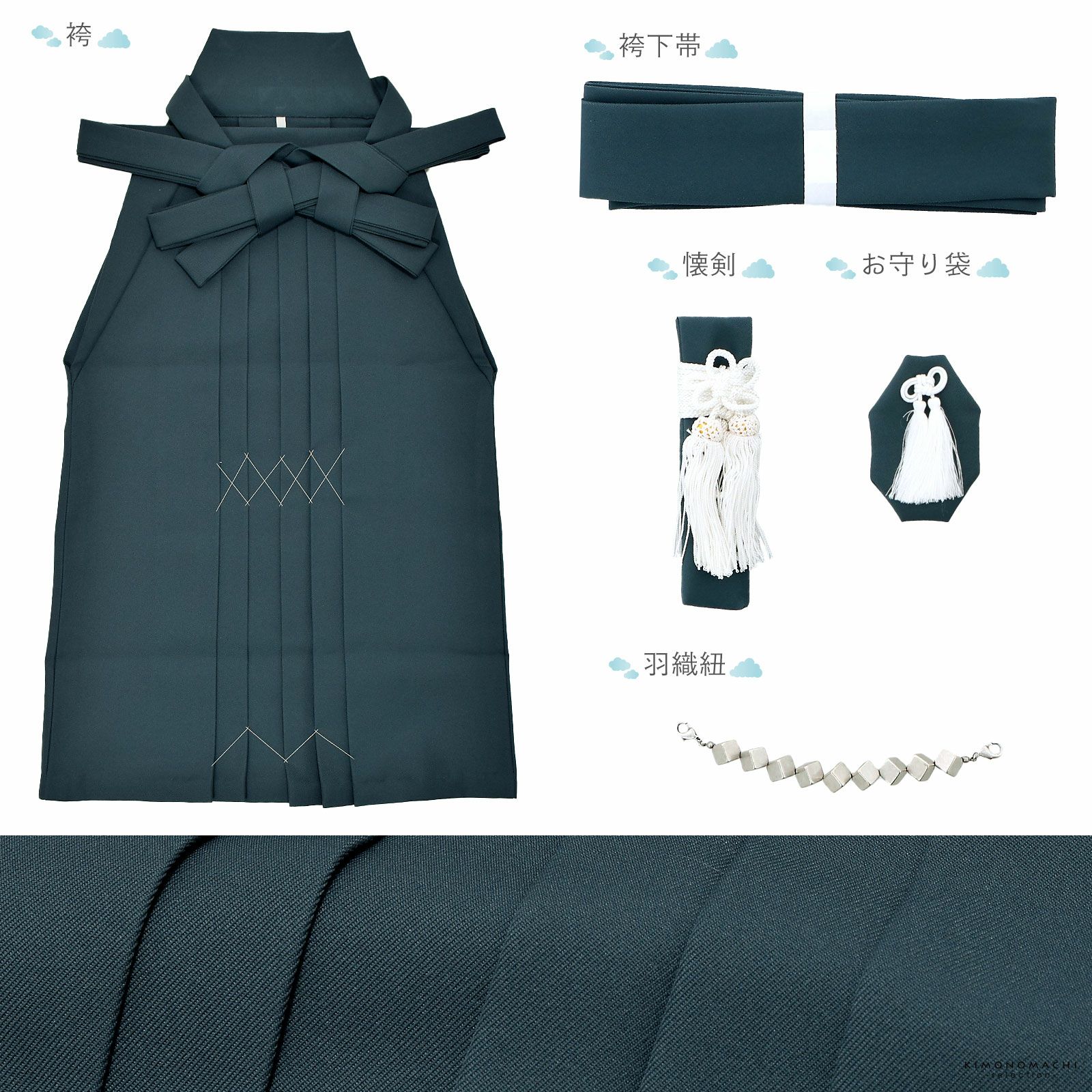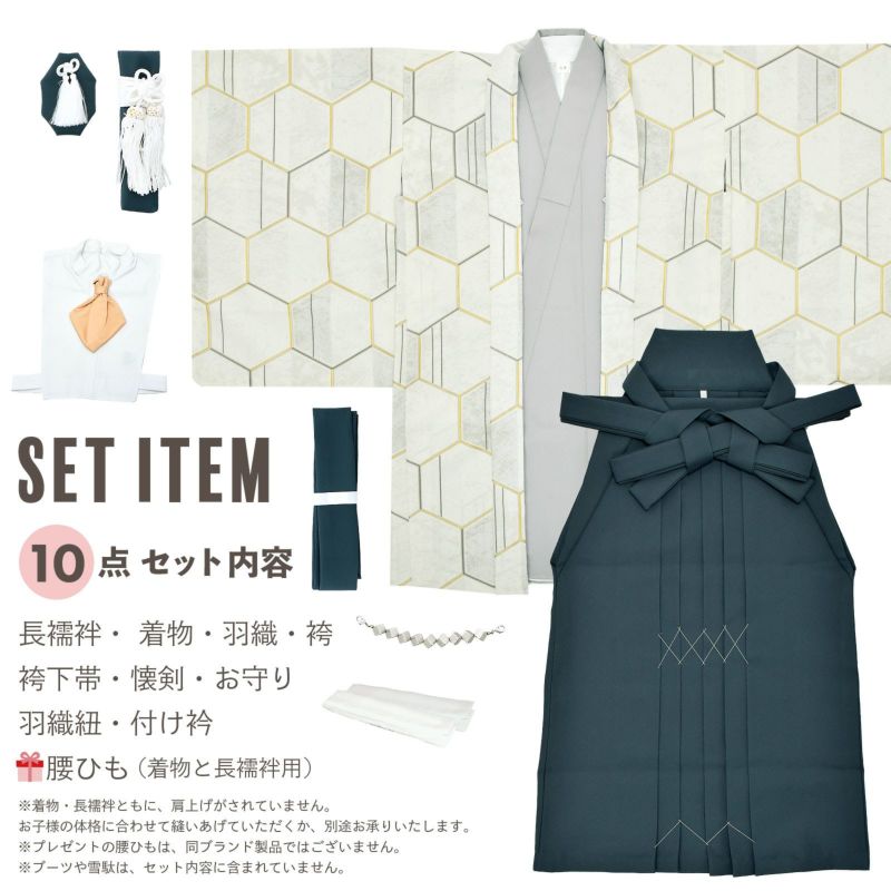【商品内容】長襦袢・着物・羽織・袴・袴下帯・懐剣・お守り・羽織紐・付け衿・腰ひも2本(プレゼント)の計10点