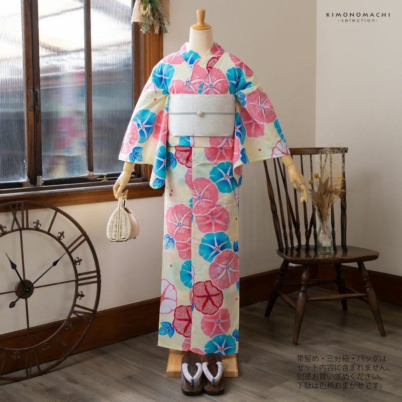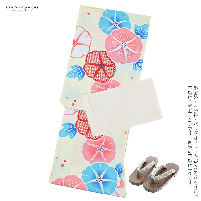 【商品内容】浴衣、帯、色柄おまかせ下駄の計3点セット