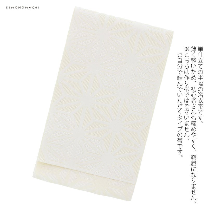 帯は単仕立ての半幅帯です。生地に織り込まれた麻の葉の柄が派手すぎず、浴衣を引き立てます。薄く軽いため、初心者さんも締めやすく、窮屈になりません。